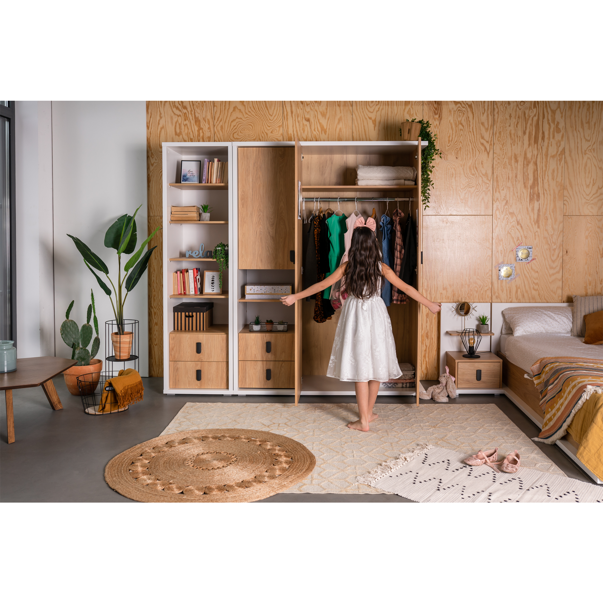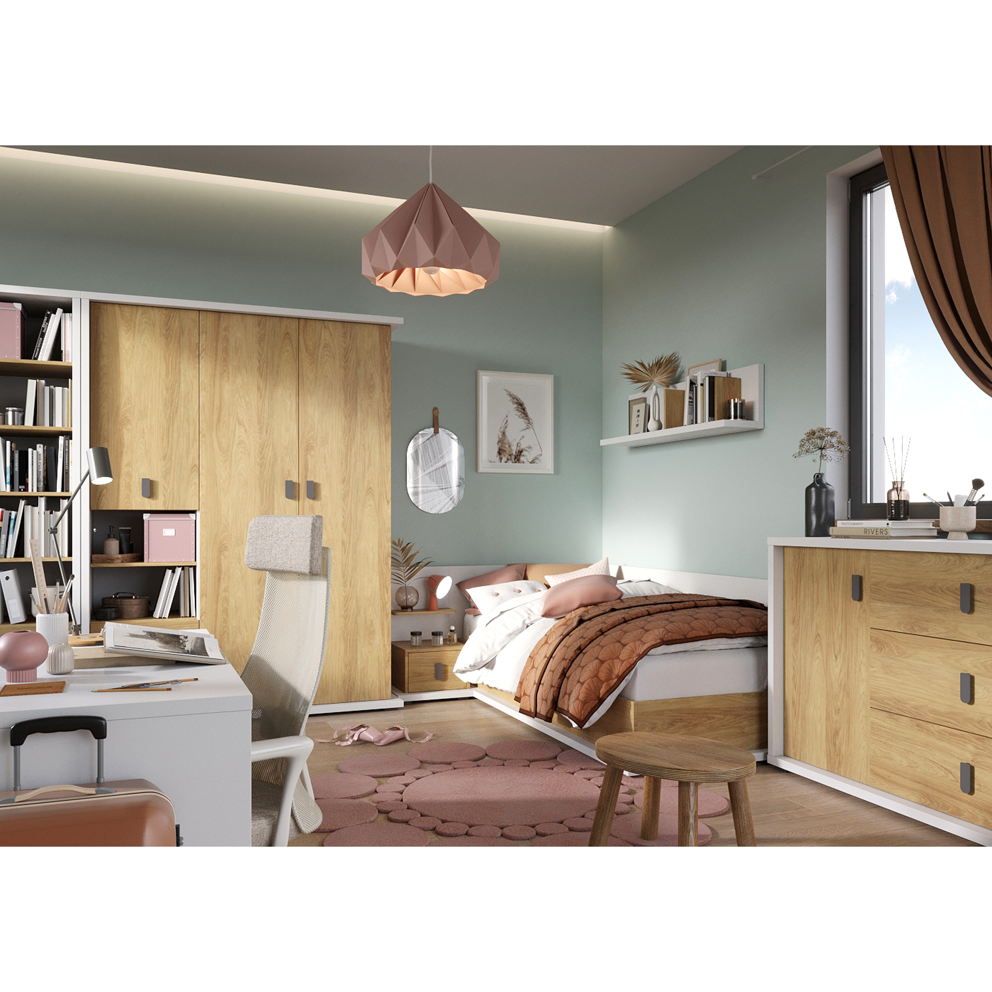 Stolik nocny Simi wyróżnia się tylnią blendą i wysuniętą podstawą, które nadają meblowi wyjątkowego charakteru. Te elementy sprawiają, że stolik tworzy modną i efektowną całość, szczególnie w zestawieniu z łóżkiem z kolekcji Simi. Ponadczasowe połączenie białego alpejskiego koloru z ciepłym dekorem hikory tworzy przytulną atmosferę i harmonijnie komponuje się z innymi elementami wnętrza.