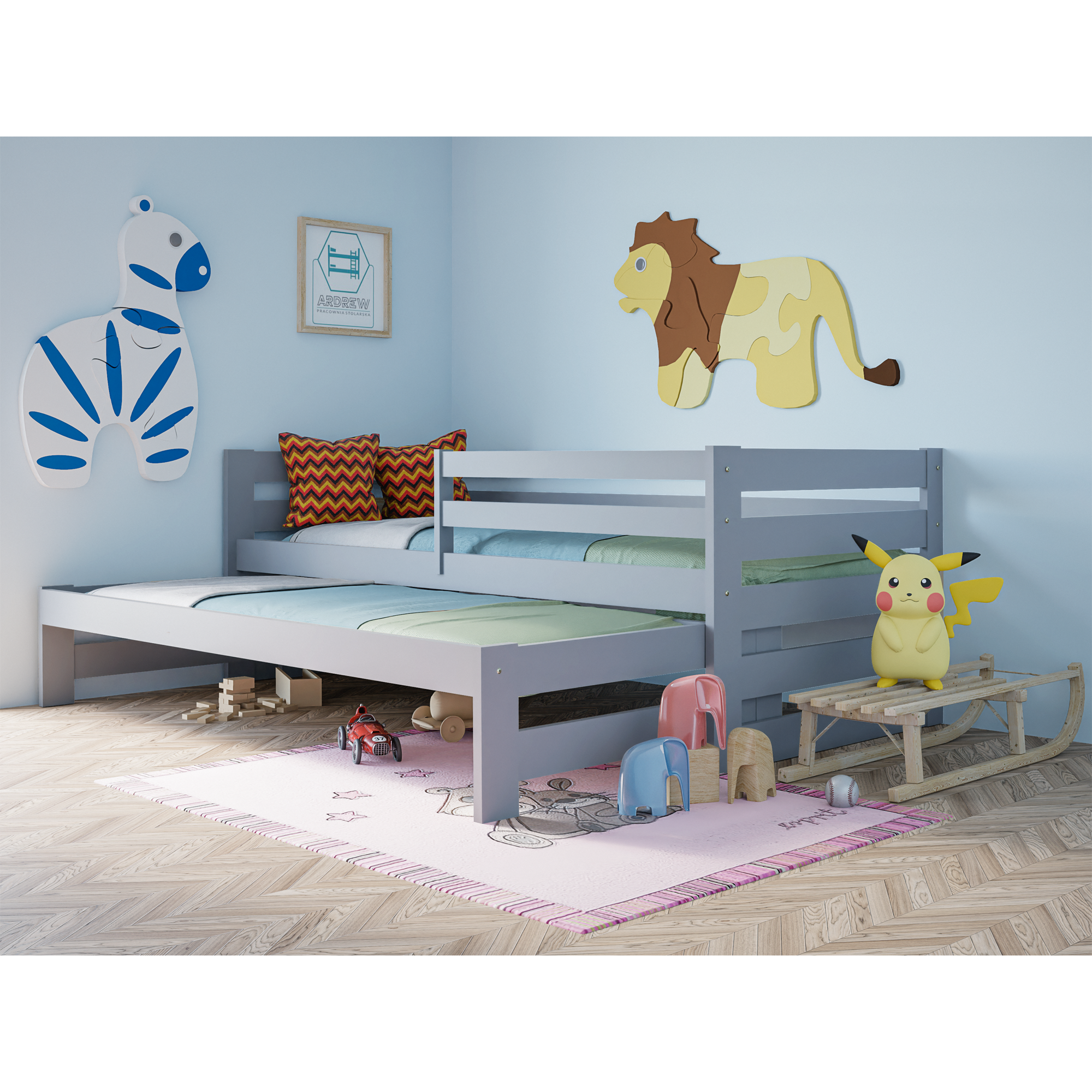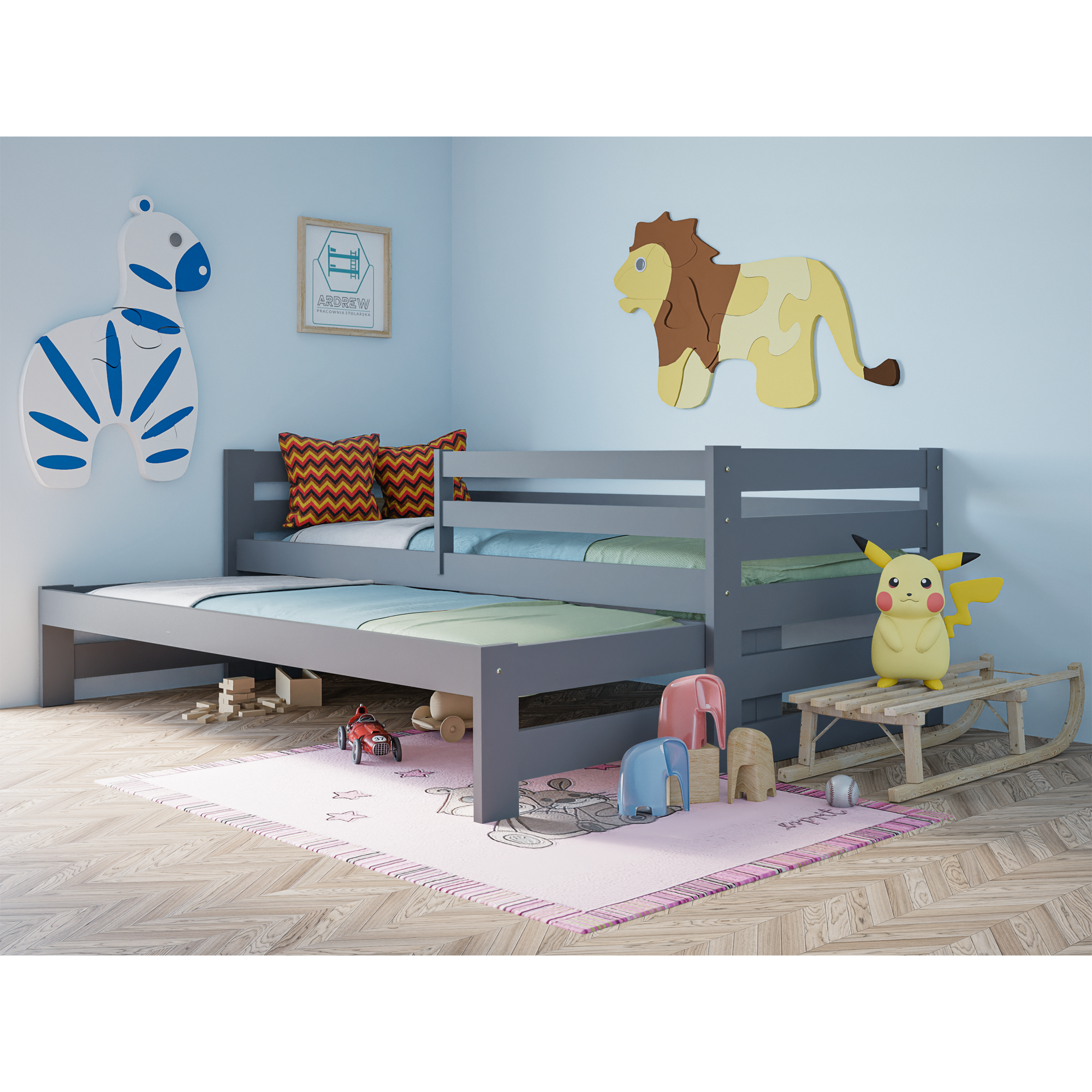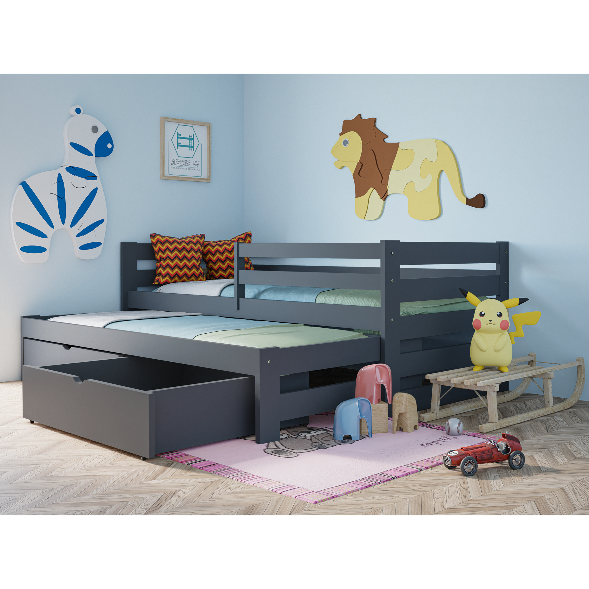 Łóżko piętrowe Sydney to idealne połączenie funkcjonalności i bezpieczeństwa. Dzięki dodatkowemu wysuwanemu łóżku zyskujesz wygodne miejsce do spania dla dwóch osób, a opcjonalne szuflady pomagają utrzymać porządek w pokoju. To inwestycja w komfort, estetykę i praktyczne rozwiązania, które sprawdzą się w każdym domu.