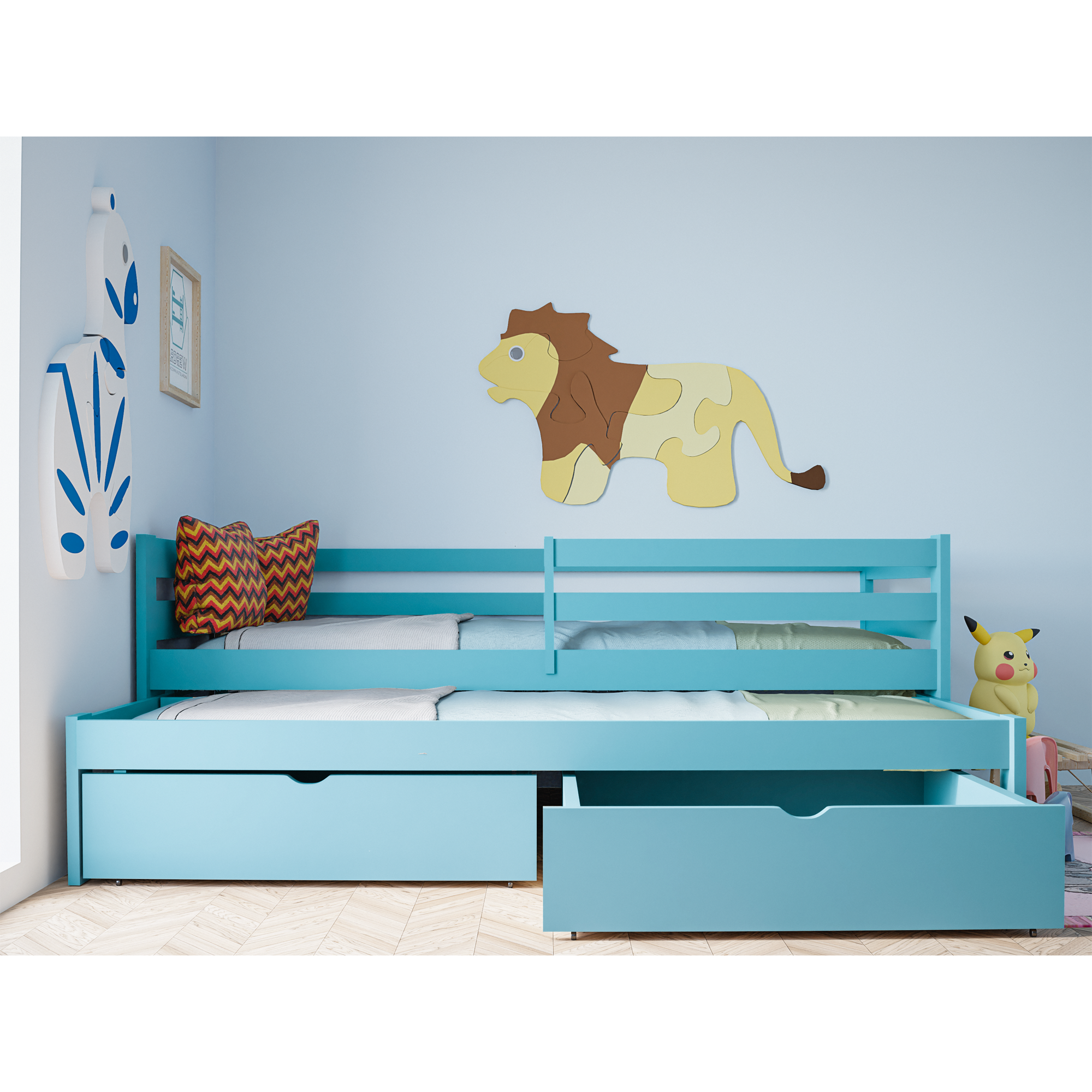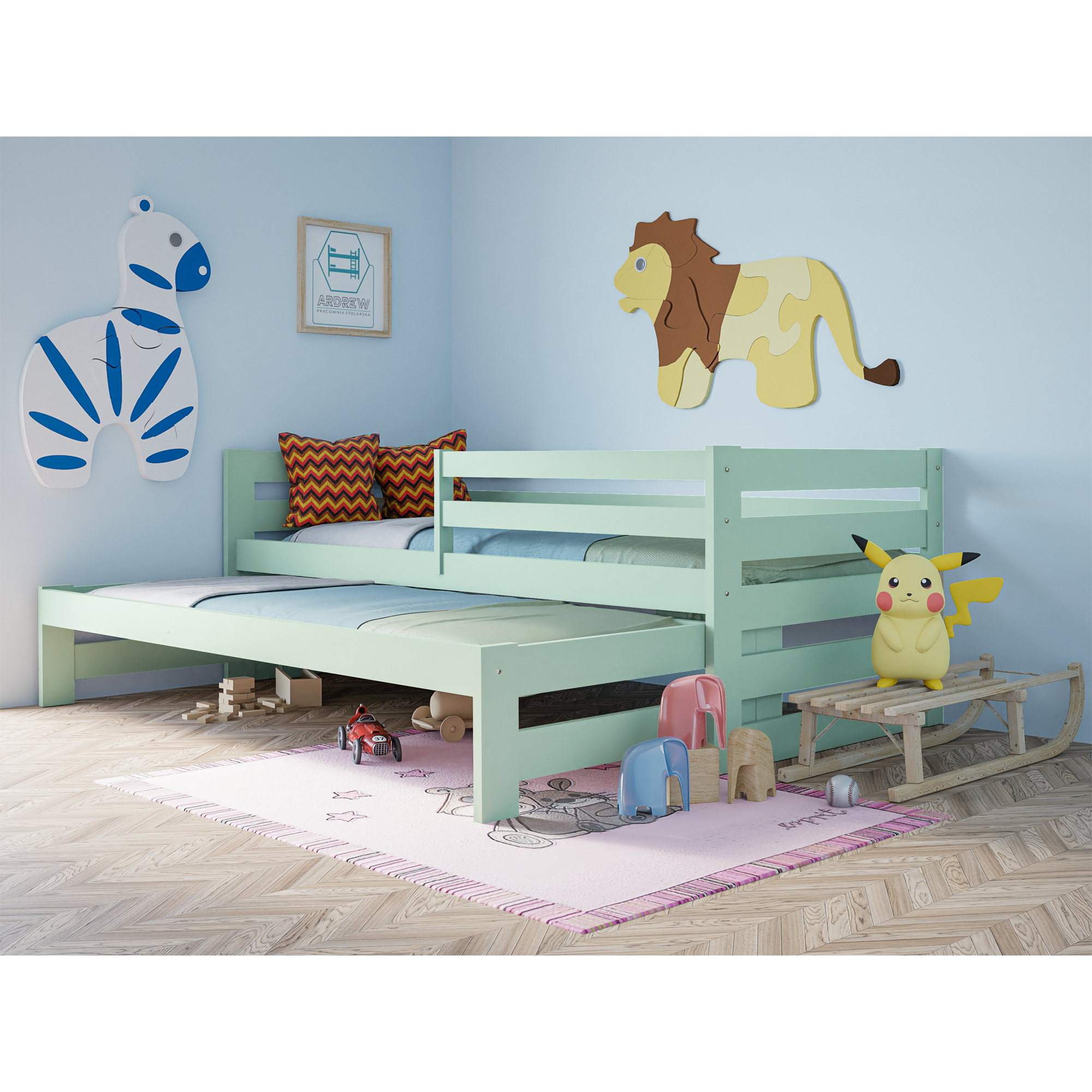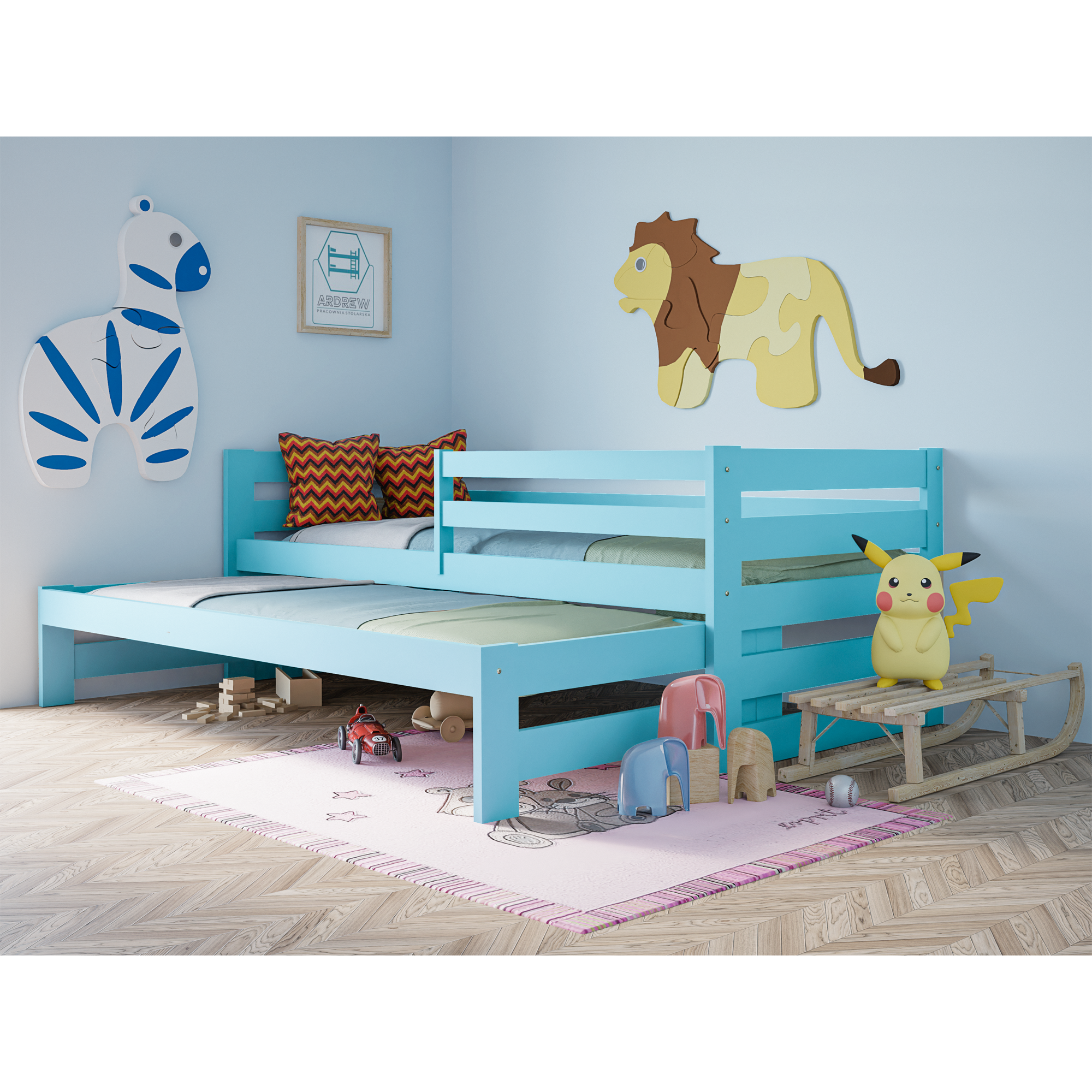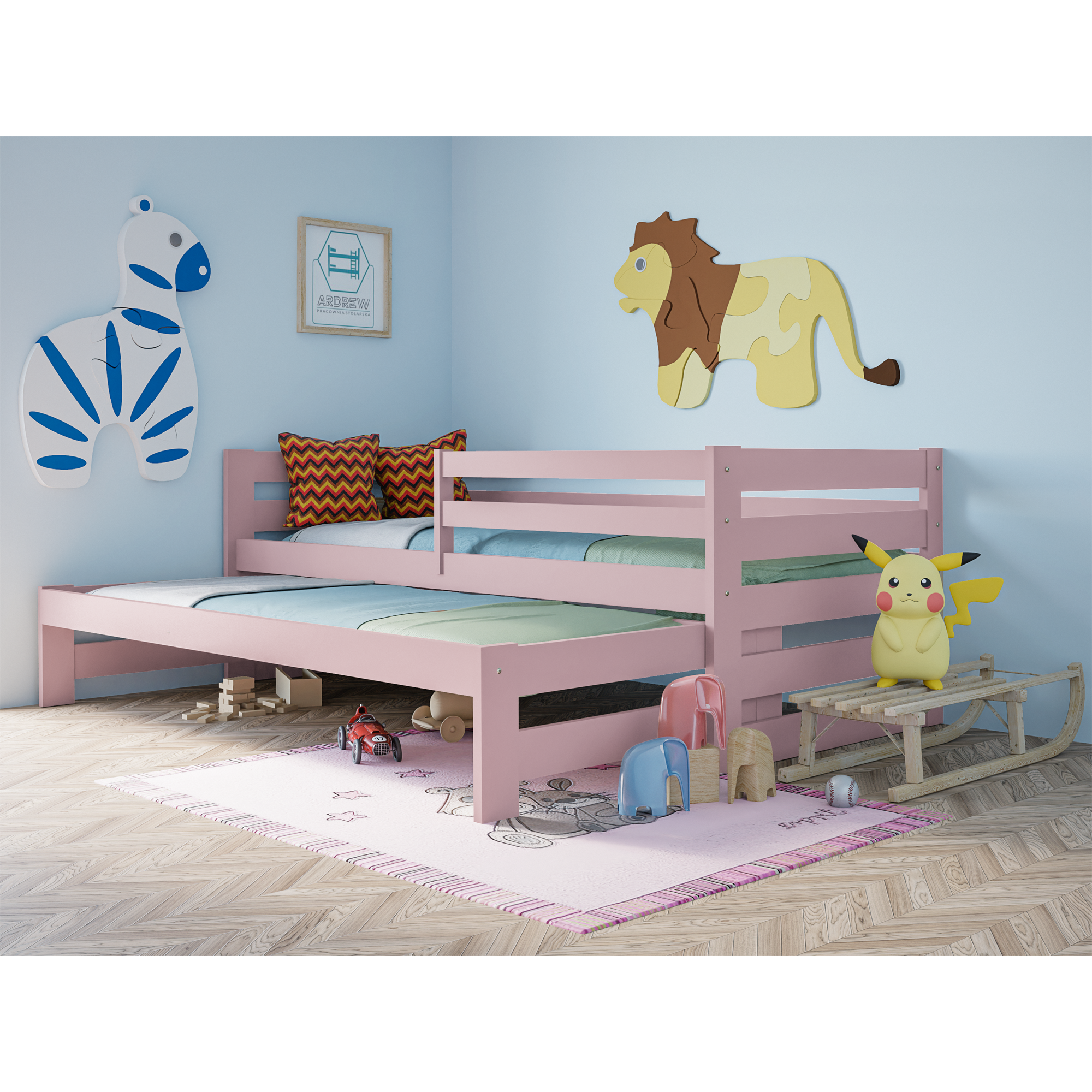 Łóżko piętrowe Sydney to idealne połączenie funkcjonalności i bezpieczeństwa. Dzięki dodatkowemu wysuwanemu łóżku zyskujesz wygodne miejsce do spania dla dwóch osób, a opcjonalne szuflady pomagają utrzymać porządek w pokoju. To inwestycja w komfort, estetykę i praktyczne rozwiązania, które sprawdzą się w każdym domu.