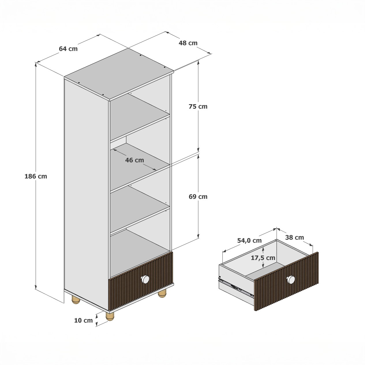 - Wymiar użytkowy szuflady: 54 × 38 × 17,5 cm