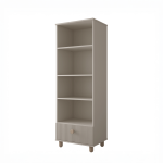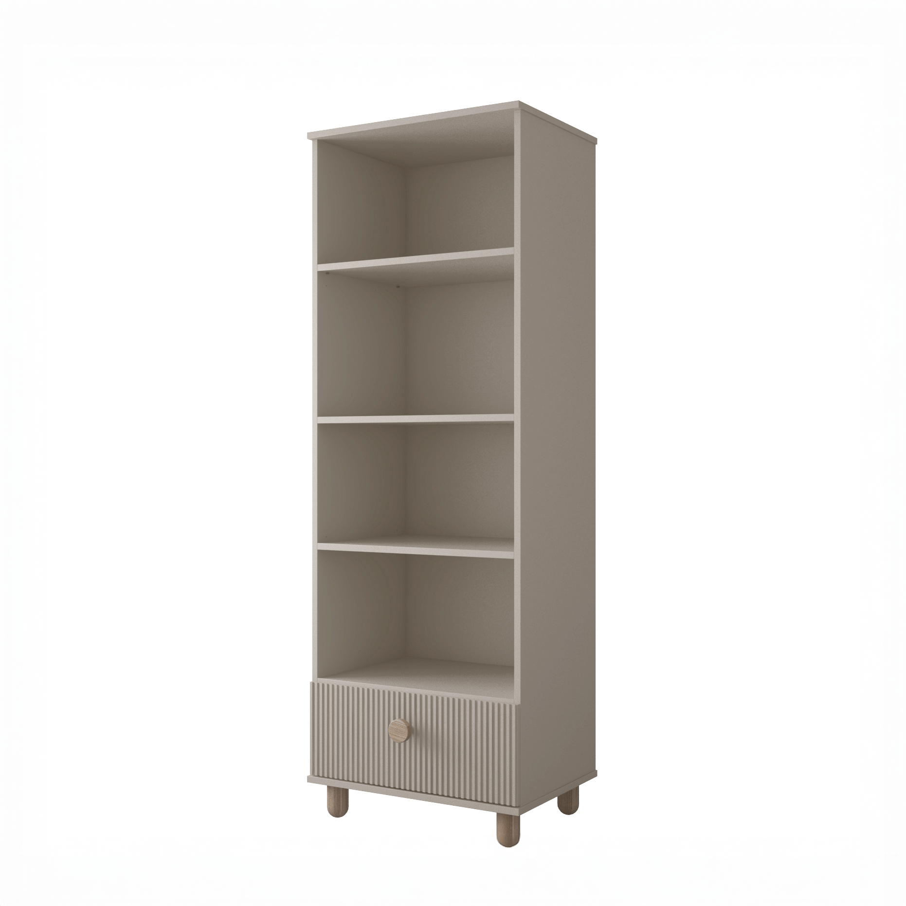 Dzięki stonowanej kolorystyce – Biały lub Kaszmir – regał doskonale dopasuje się do wystroju każdego wnętrza, wnosząc do niego lekkość i przytulność. Delikatne pionowe frezowania oraz naturalne bukowe nóżki i uchwyty stanowią subtelne, eleganckie wykończenie całości.
