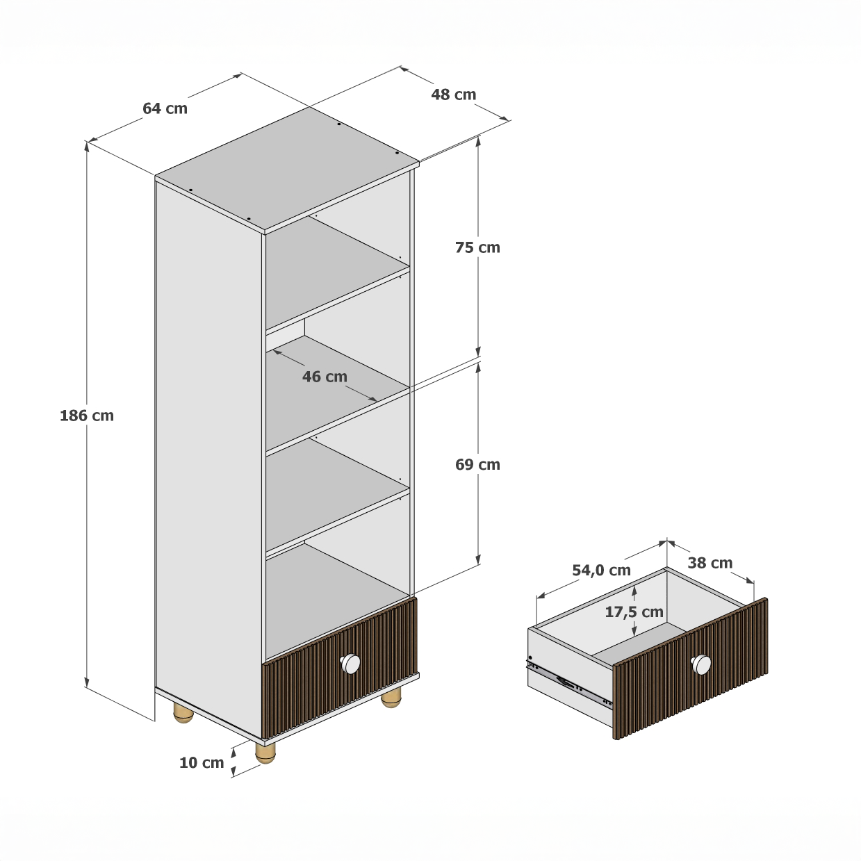 - Wymiar użytkowy szuflady: 54 × 38 × 17,5 cm