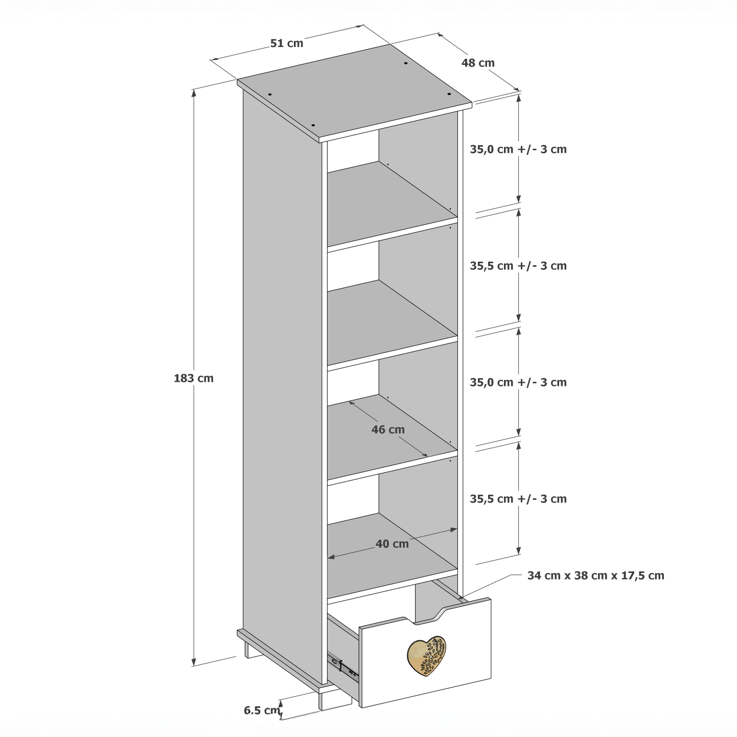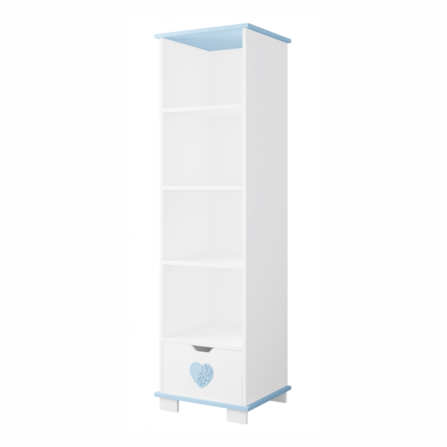 Model LOVE wyróżnia się prostym designem wzbogaconym o delikatny detal w postaci dekoracyjnego serduszka. Cztery otwarte półki zapewniają łatwy dostęp do ulubionych przedmiotów dziecka, a pojemna dolna szuflada pozwala wygodnie schować akcesoria, zabawki lub tekstylia. Regał stanowi spójny element kolekcji LOVE, zaprojektowanej z myślą o jasnych i przyjaznych wnętrzach.