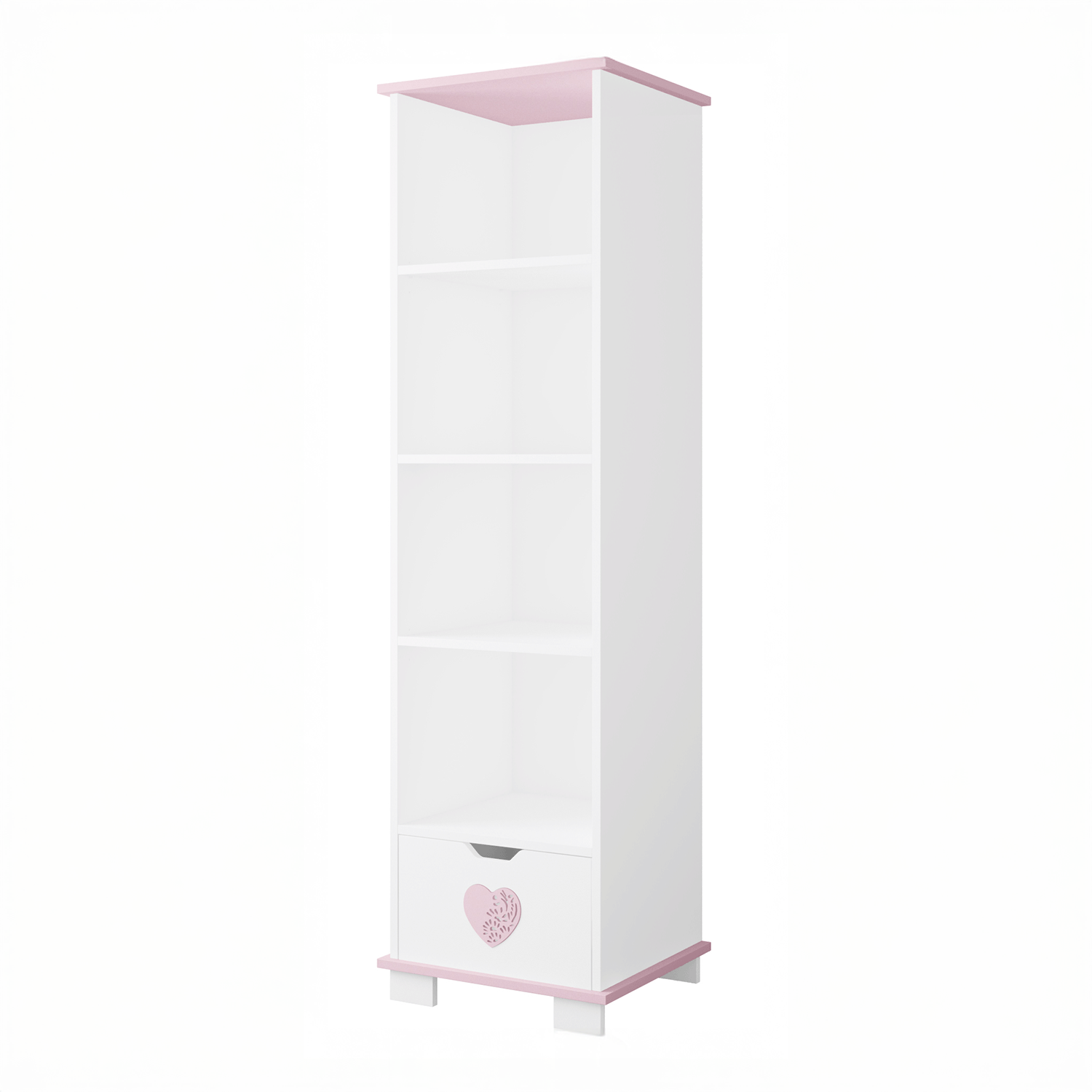 Regał dziecięcy LOVE z półkami i szufladą – biały z dekoracyjnym serduszkiem