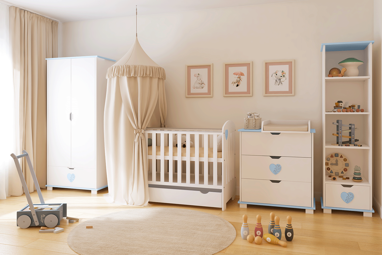 Jasny i lekki wizualnie — rozświetla dziecięce wnętrze.