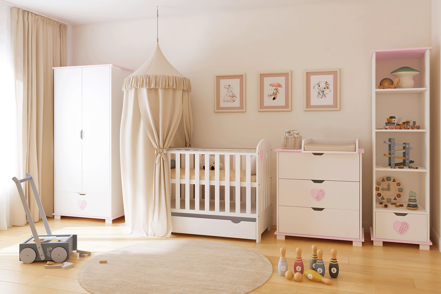 Biały z różowym serduszkiem — idealny do pokoju dziewczynki