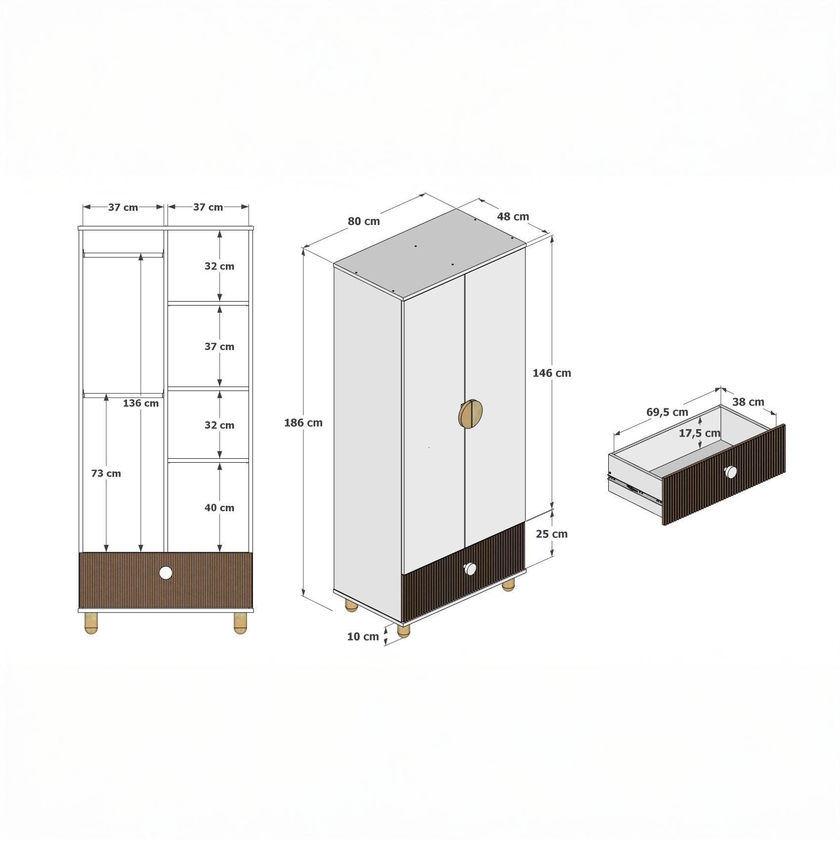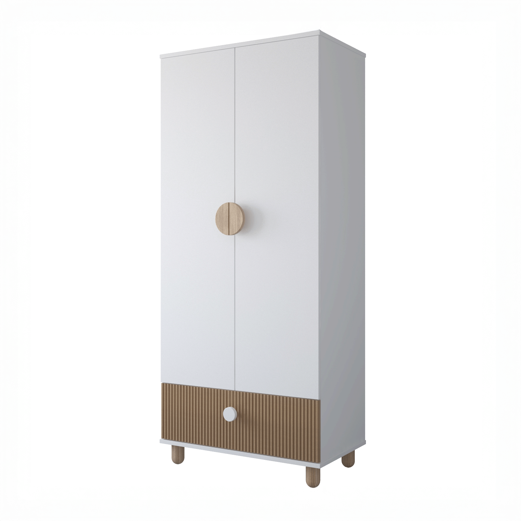 Szafa dwudrzwiowa z kolekcji Cozy LOFT to elegancki i funkcjonalny mebel, który doskonale wpasuje się w nowoczesne wnętrze. Dzięki przemyślanemu układowi wnętrza – z drążkami, półkami i szufladą – zapewnia wygodne przechowywanie ubrań, pościeli oraz dodatków. To idealne rozwiązanie do pokoju dziecka, nastolatka, a także do przestrzeni rodzinnej, w której liczy się zarówno estetyka, jak i praktyczność.
