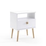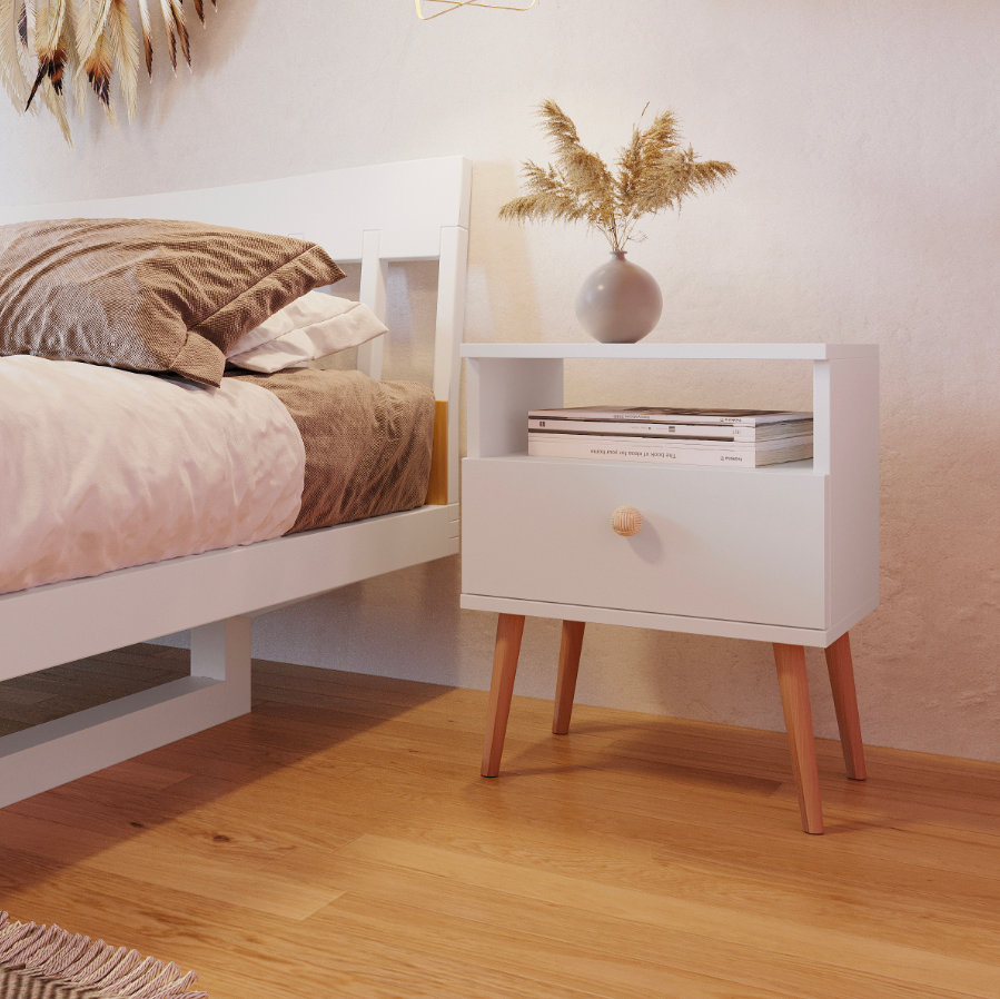 Wybierz stolik nocny, który idealnie wpisze się w charakter Twojej sypialni. Dostępny w czterech różnych wersjach matowych kolorów: Cappuccino, Biały, Róż oraz Dąb Craft złoty. Solidne drewniane nogi doskonale komponują się z pozostałymi meblami z kolekcji, zapewniając spójny wystrój wnętrza.