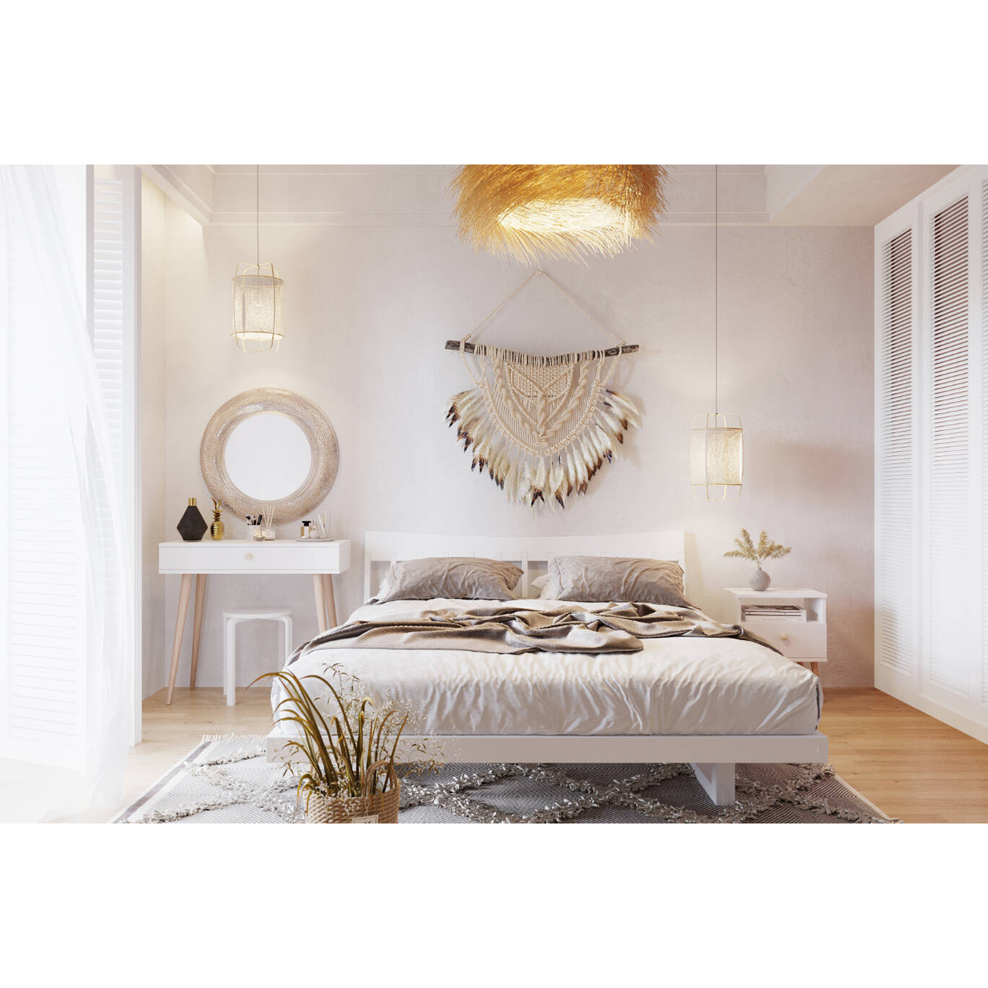 Stolik nocny w stylu boho to nie tylko praktyczne rozwiązanie, ale również efektowny element dekoracyjny. Jego proporcje są odpowiednio dobrane, aby pasował do różnych rozmiarów sypialni, a dolna szuflada i półka zapewniają wygodne przechowywanie najpotrzebniejszych rzeczy. Wysokie nóżki nadają mu lekkości, a uchwyt z jutowego sznurka dodaje mu niepowtarzalnego charakteru.