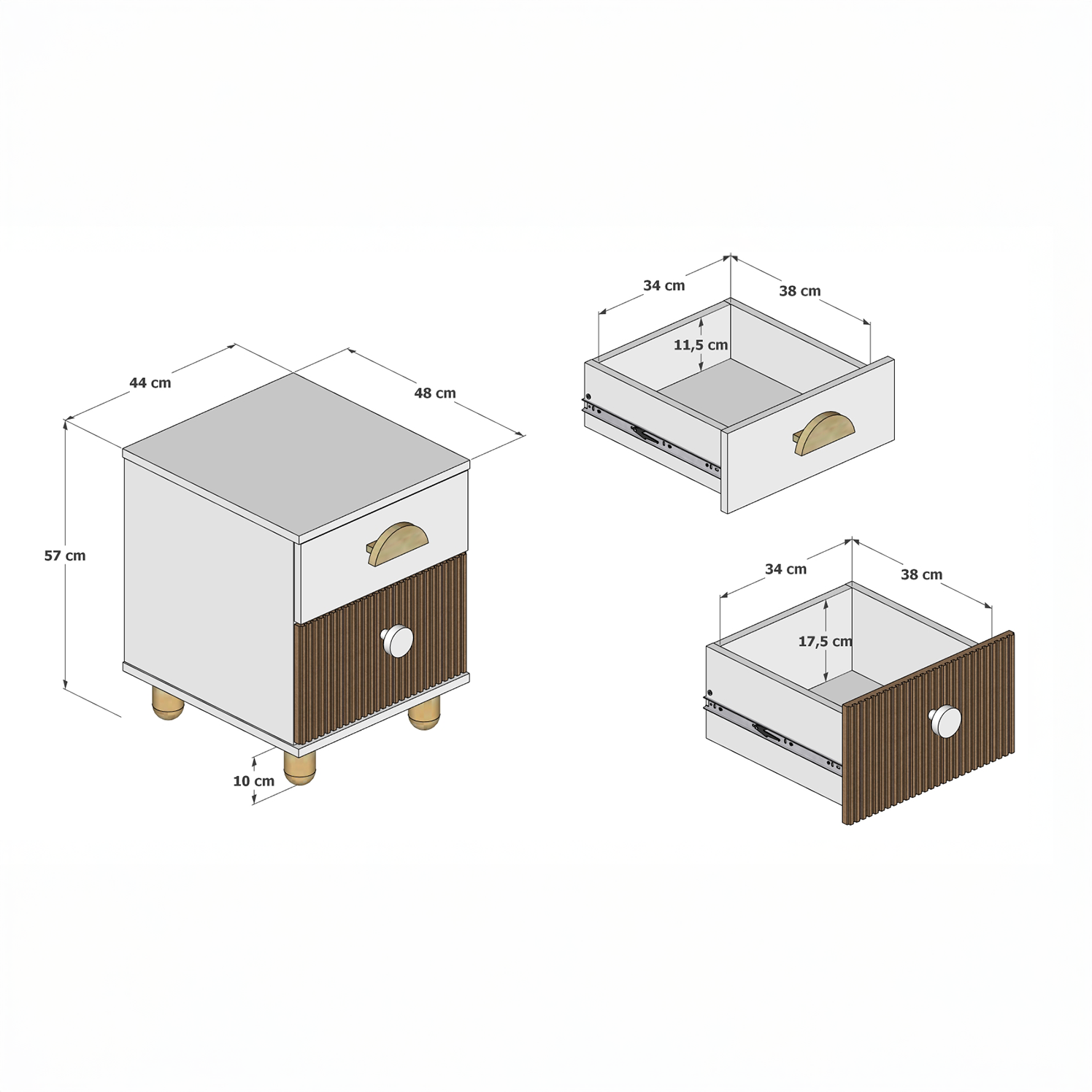 - Wymiar użytkowy dolnej szuflady: 38 × 34 × 17,5 cm