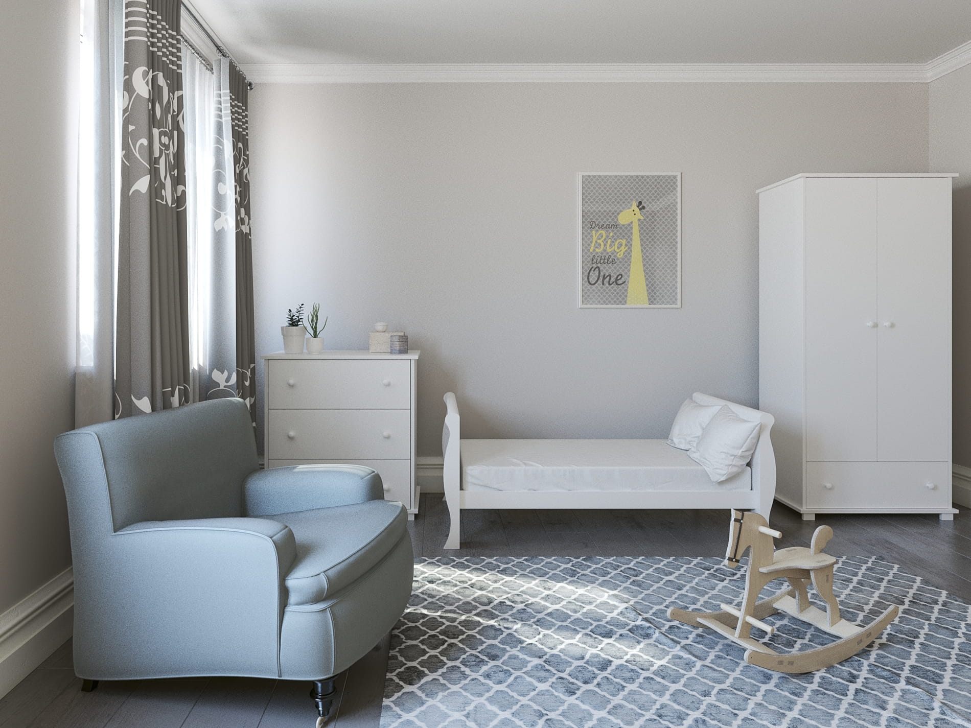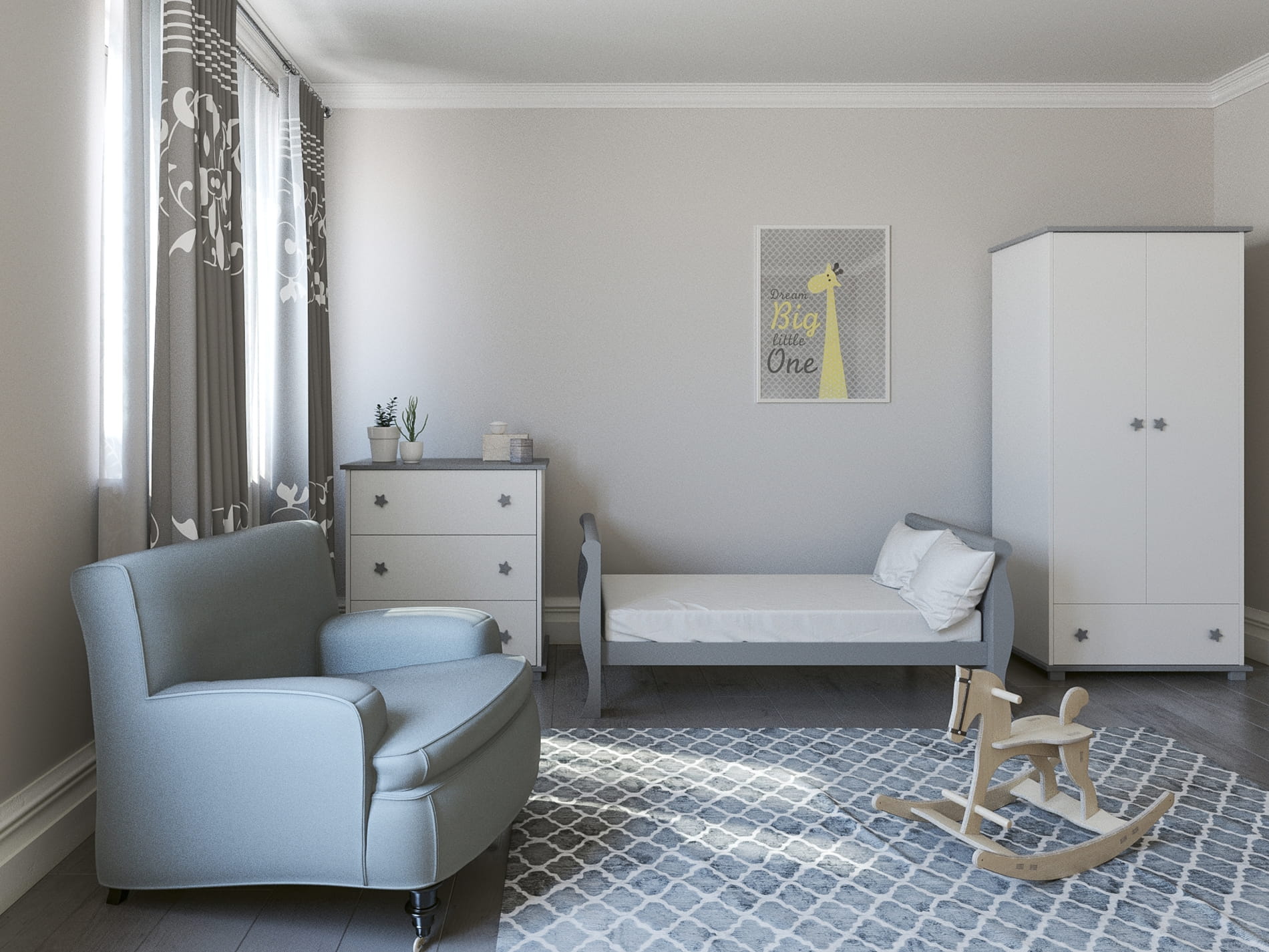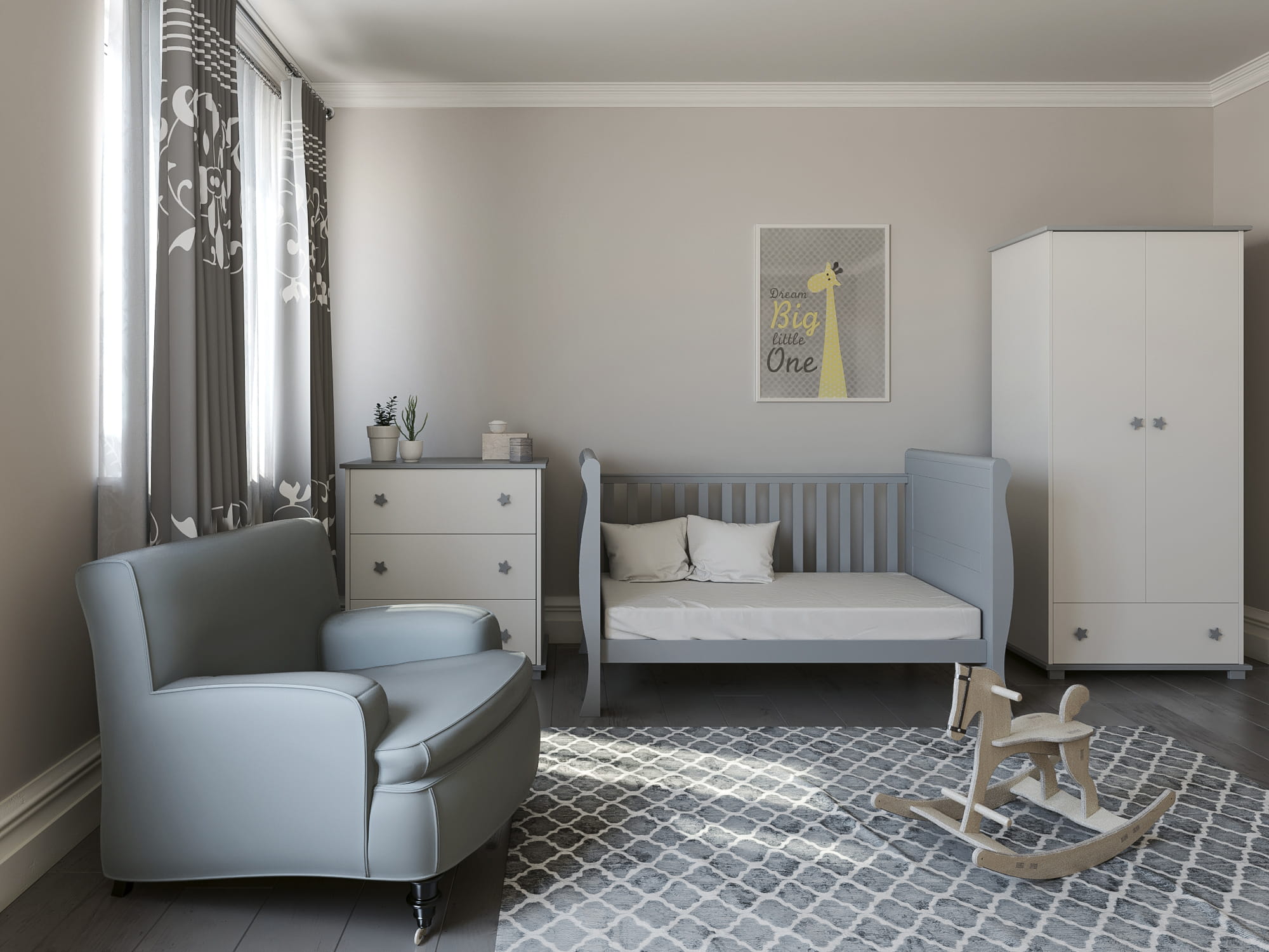 Łóżeczko zostało wykonane z wysokiej jakości płyty meblowej i drewna sosnowego. Charakteryzuje się prostym i klasycznym wzornictwem.