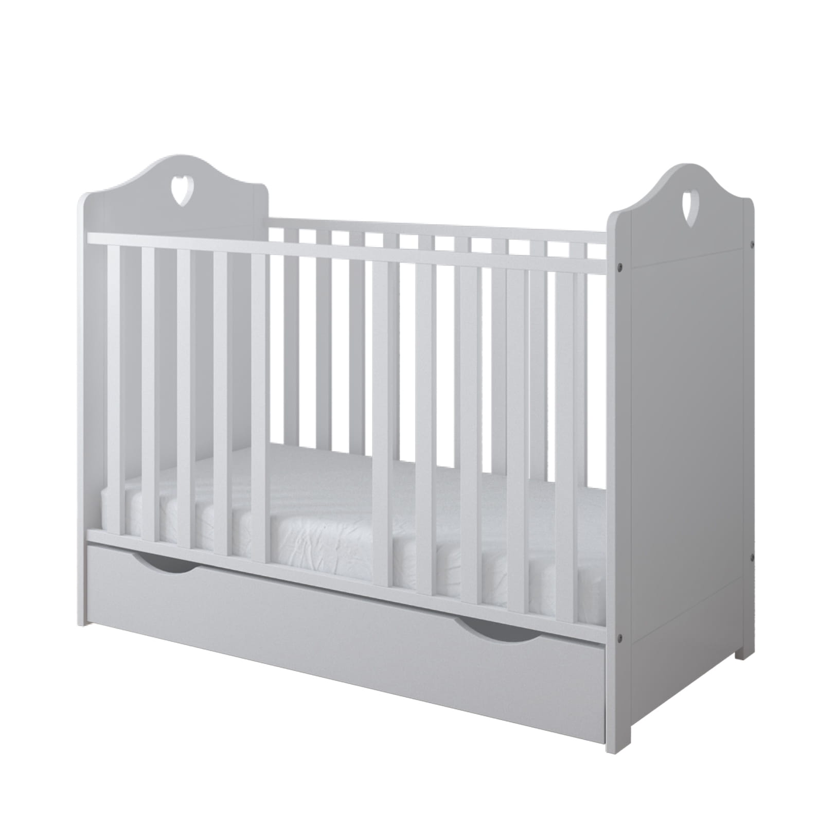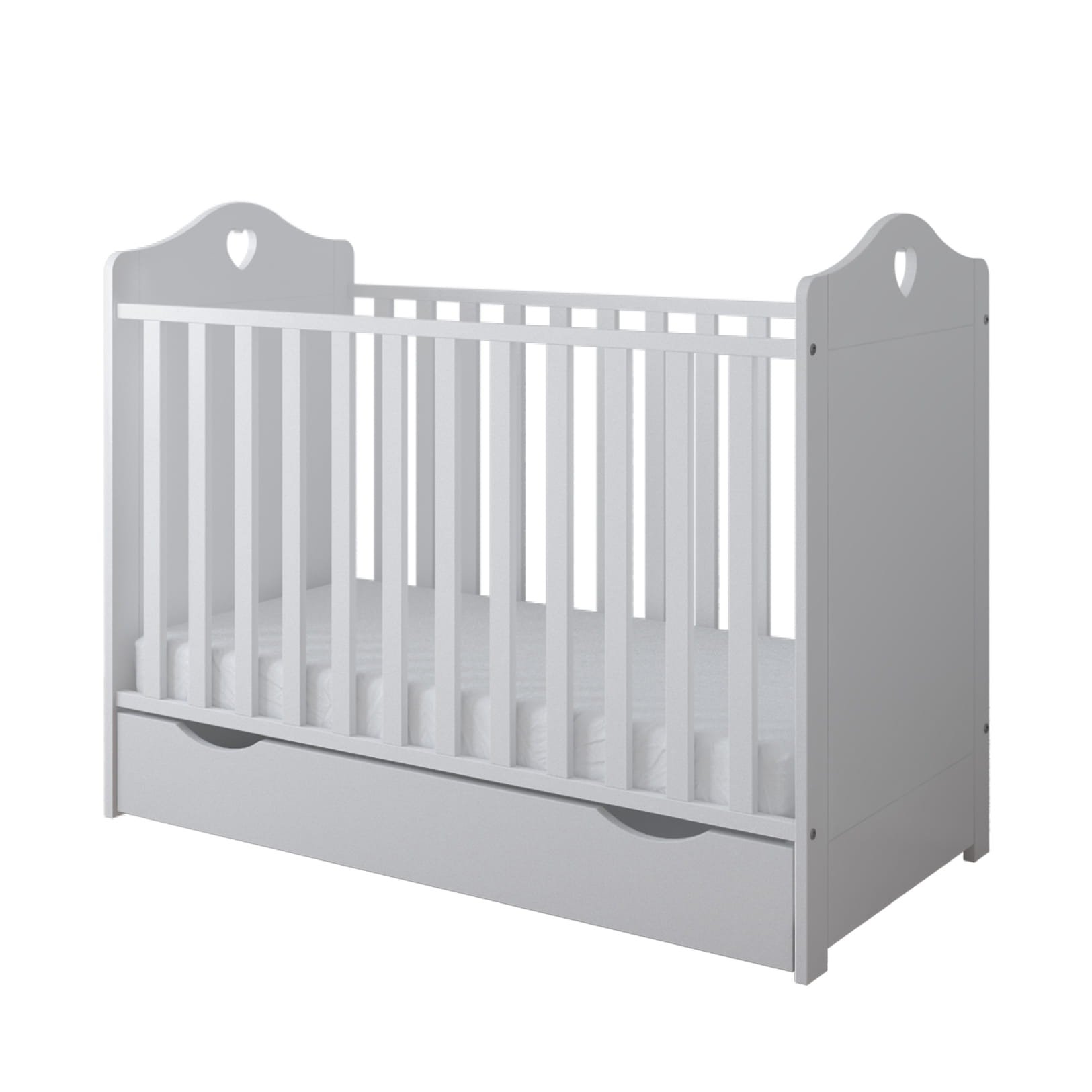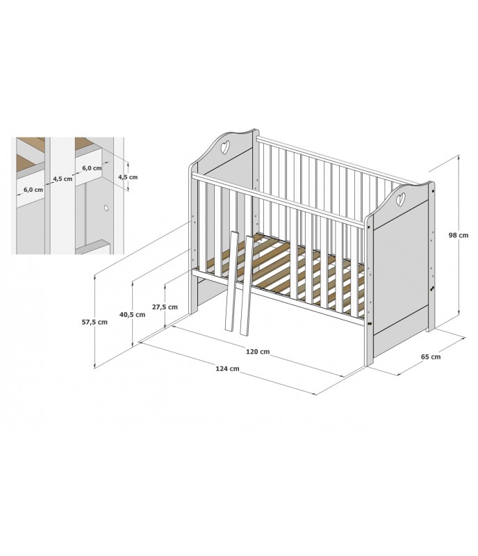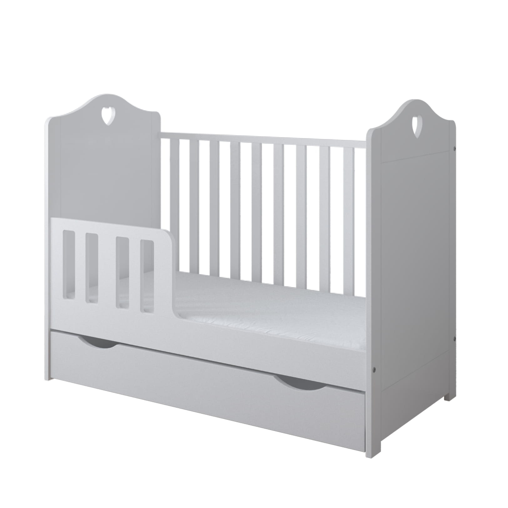 Funkcjonalne łóżeczko z ozdobnym wycięciem w kształcie serca zapewnia wygodę i bezpieczeństwo od pierwszych dni życia. Możliwość przekształcenia w tapczanik sprawia, że mebel rośnie razem z dzieckiem.