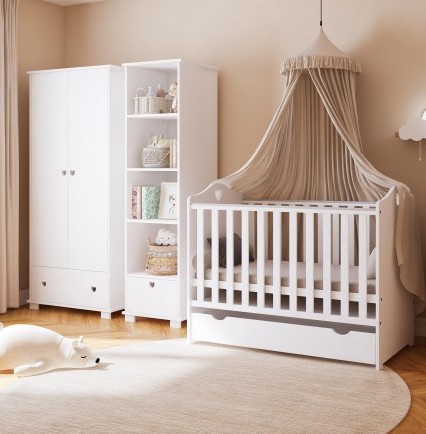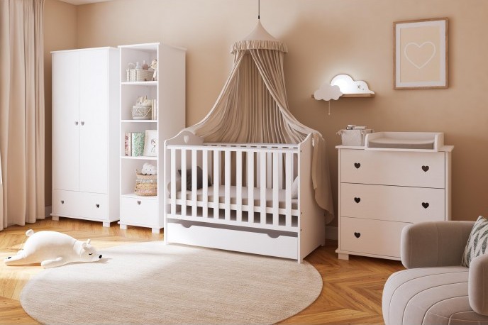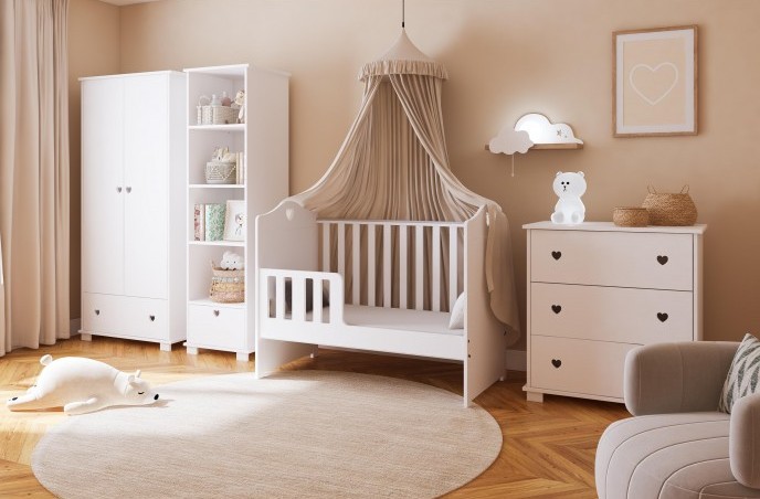 Zestaw mebli dziecięcych HEART BABY – łóżeczko, szafa i regał z serduszkiem