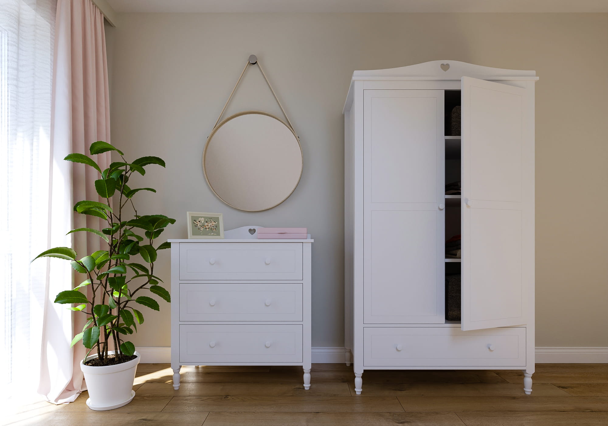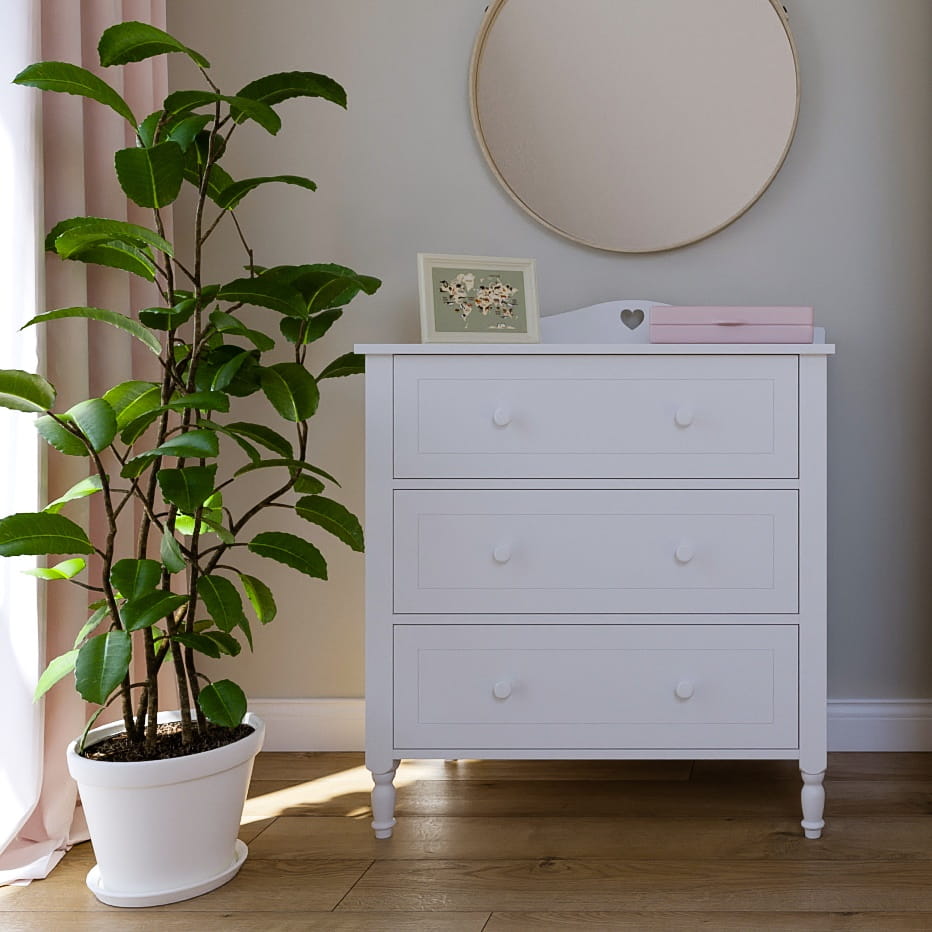 Komoda Laura Junior w ponadczasowej bieli to eleganckie rozwiązanie do przechowywania. Stojąca na rzeźbionych nogach ułatwia utrzymanie porządku. Trzy pojemne szuflady montowane na prowadnicach rolkowych są łatwe w użytkowaniu, a bezpieczne ograniczniki zapobiegają wypadaniu zawartości. Doskonała do przechowywania ubrań i innych drobiazgów, idealnie wpisuje się w estetykę pokoju dziewczynki.