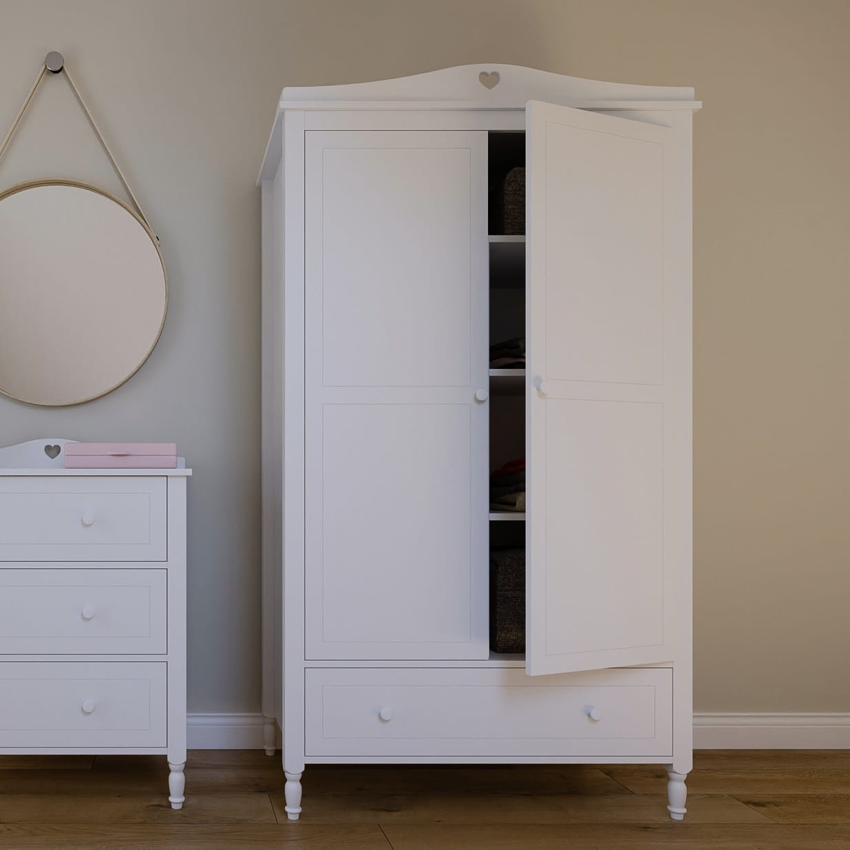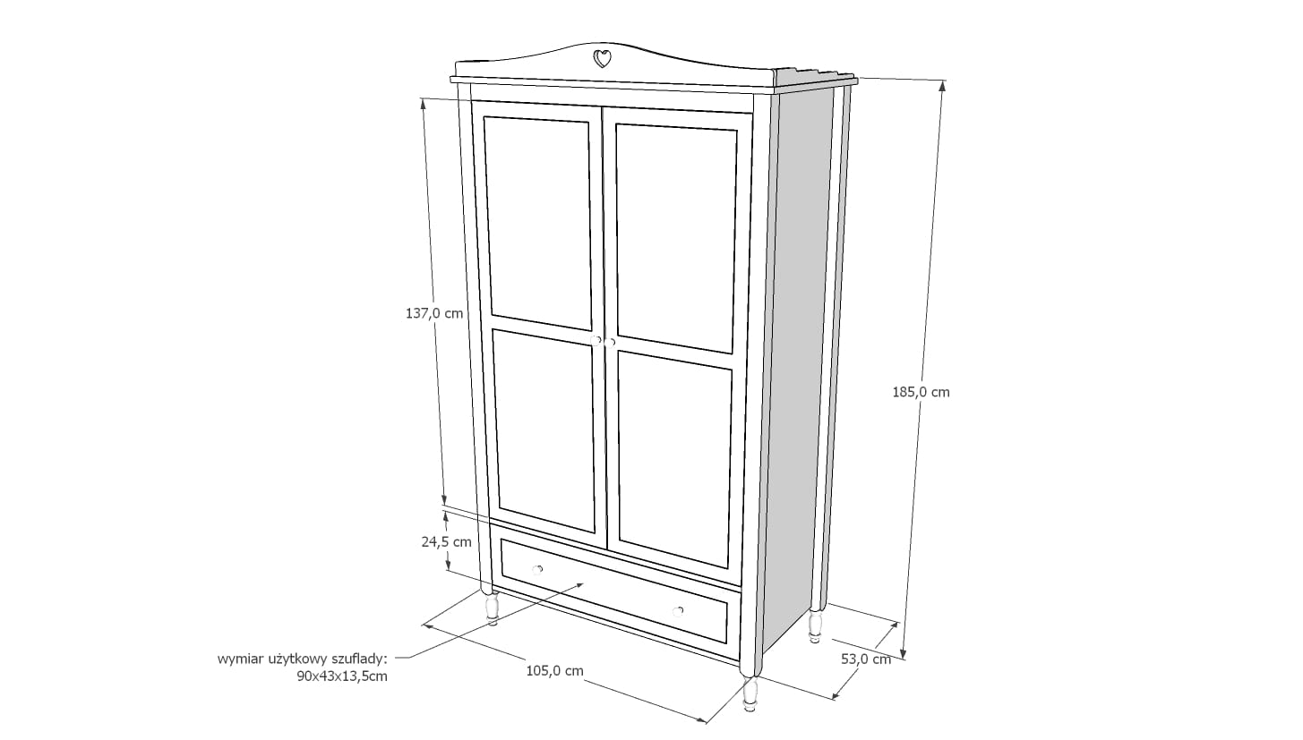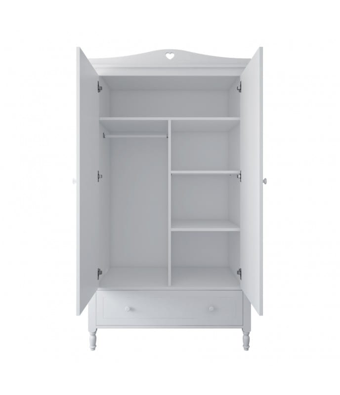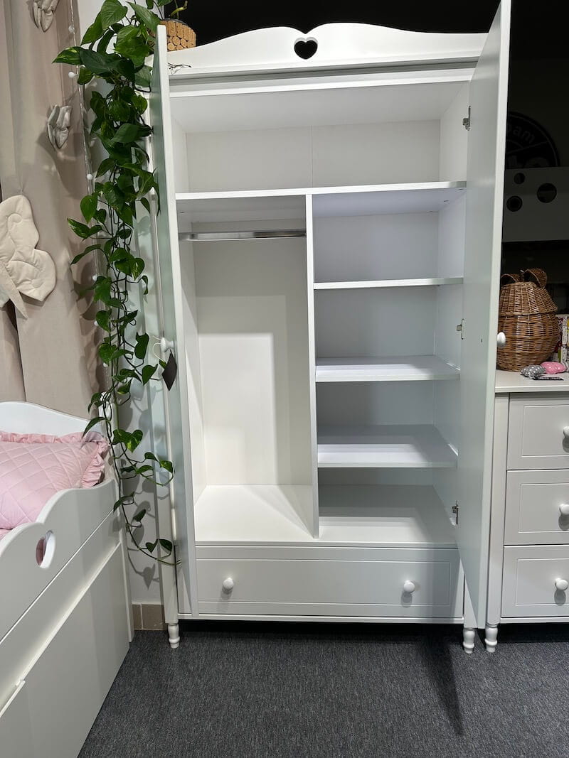 Szafa dziewczęca z nowoczesnym designem, idealna do przechowywania ubrań i akcesoriów. Regulowane półki po prawej stronie 2 drążki na ubrania po lewej stronie zapewniają dostosowanie przestrzeni do indywidualnych potrzeb. Wysuwana szuflada montowana na prowadnicach rolkowych z ogranicznikiem zapewnia bezpieczeństwo i porządek w szafie.