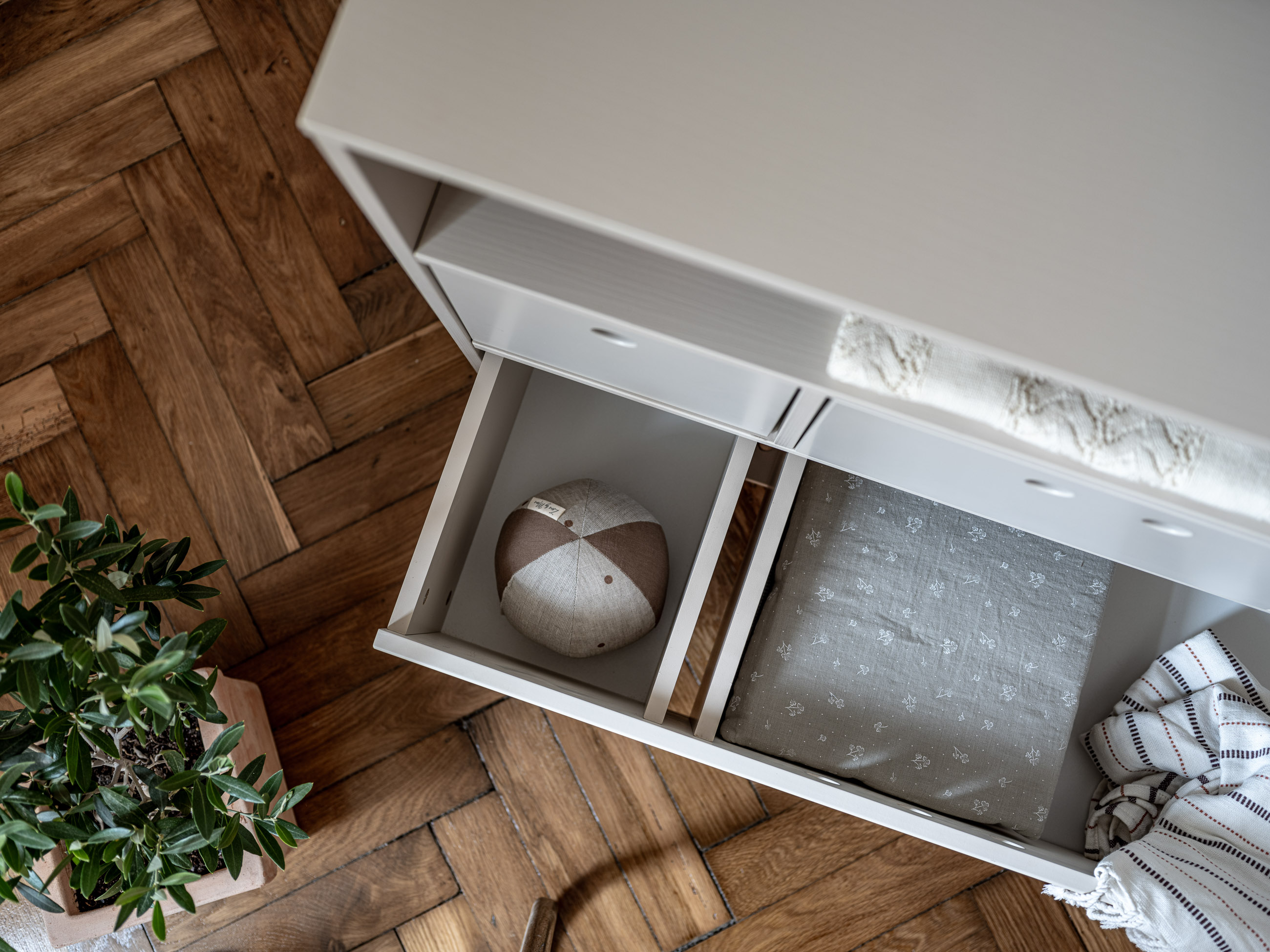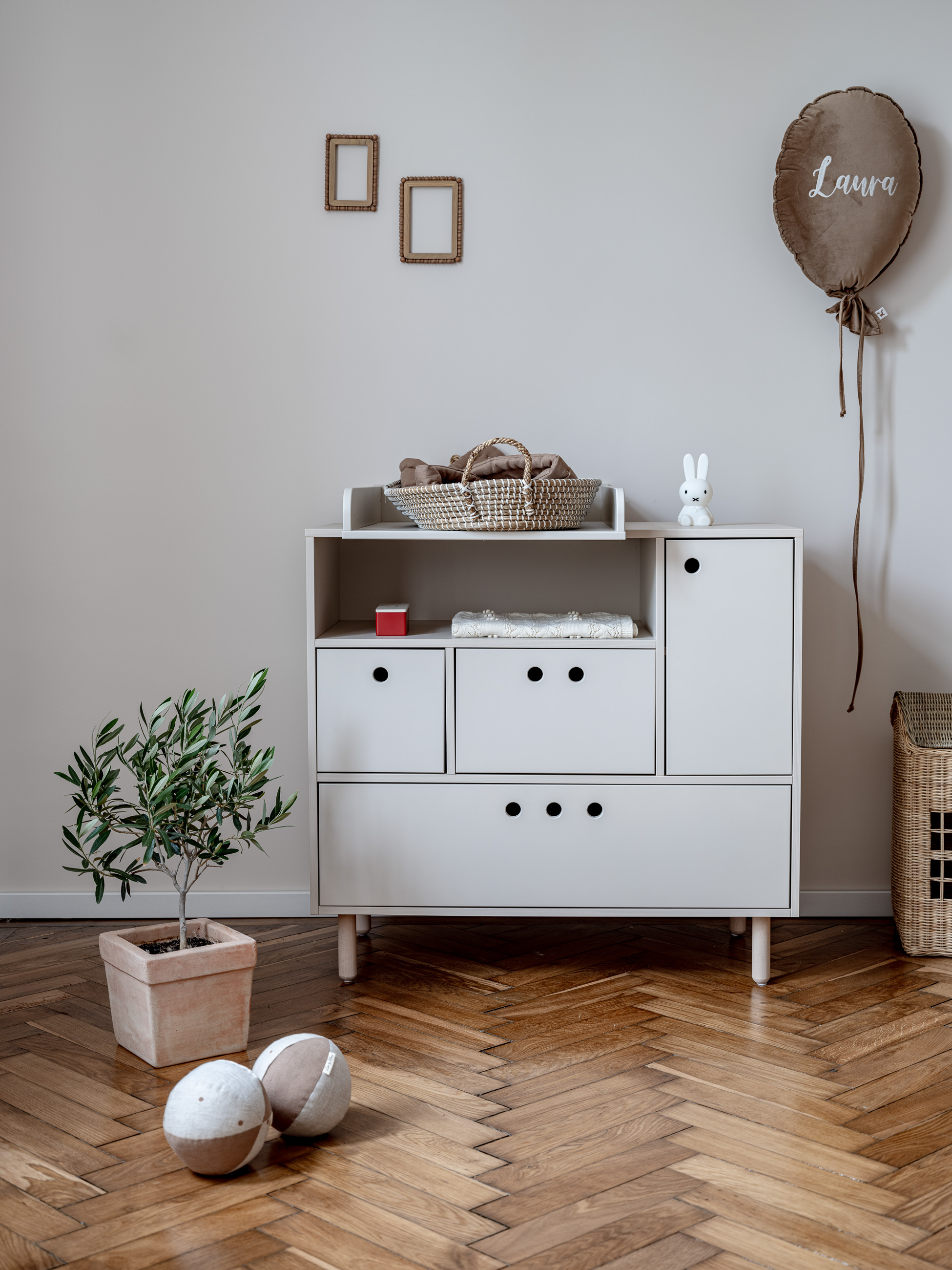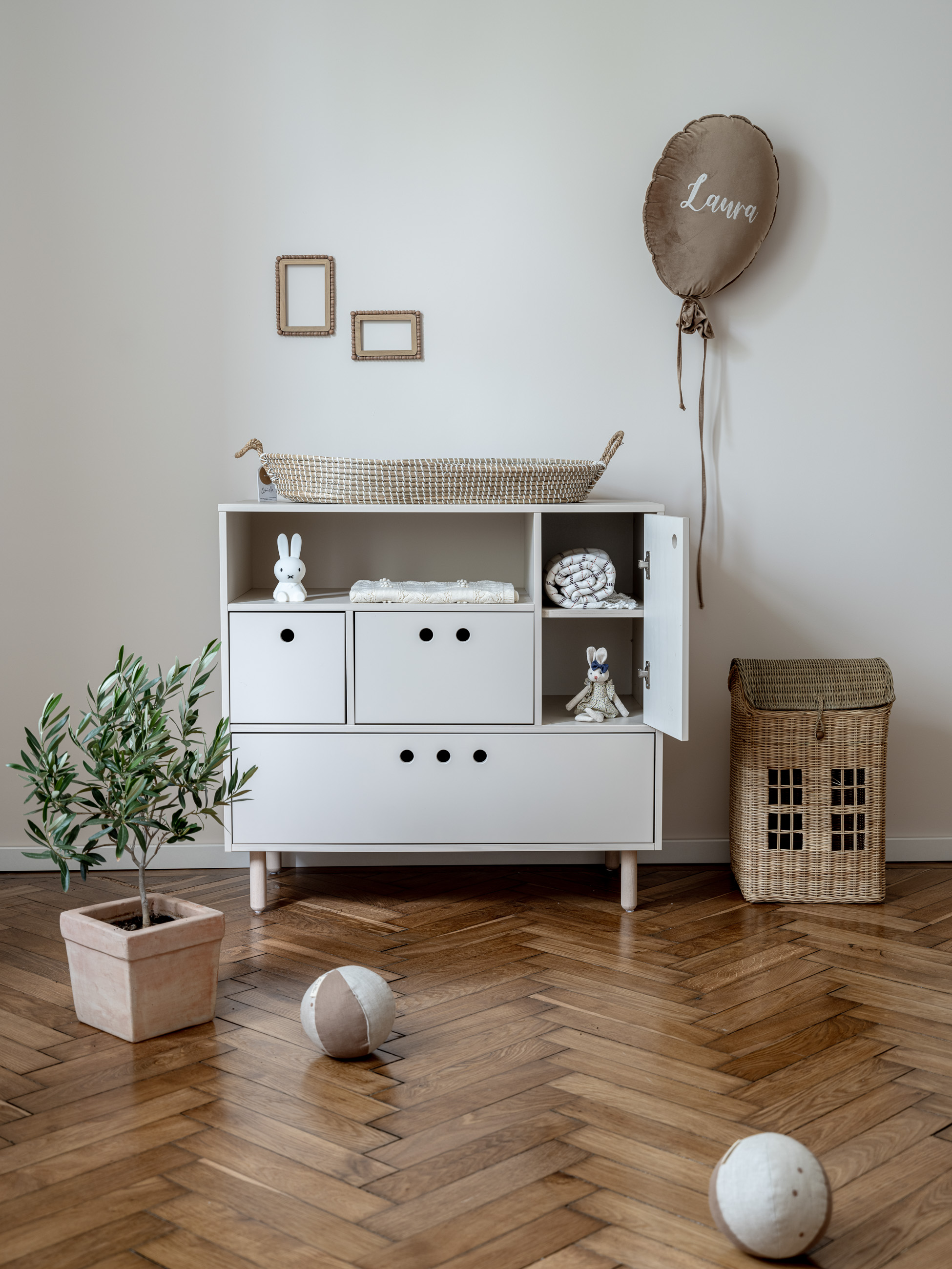 Pojemna komoda z dwiema szufladami, szafką oraz praktycznym boxem do organizacji drobiazgów. Dzięki możliwości montażu dodatkowej nakładki może pełnić funkcję przewijaka, co czyni ją idealnym meblem do pokoju niemowlaka.