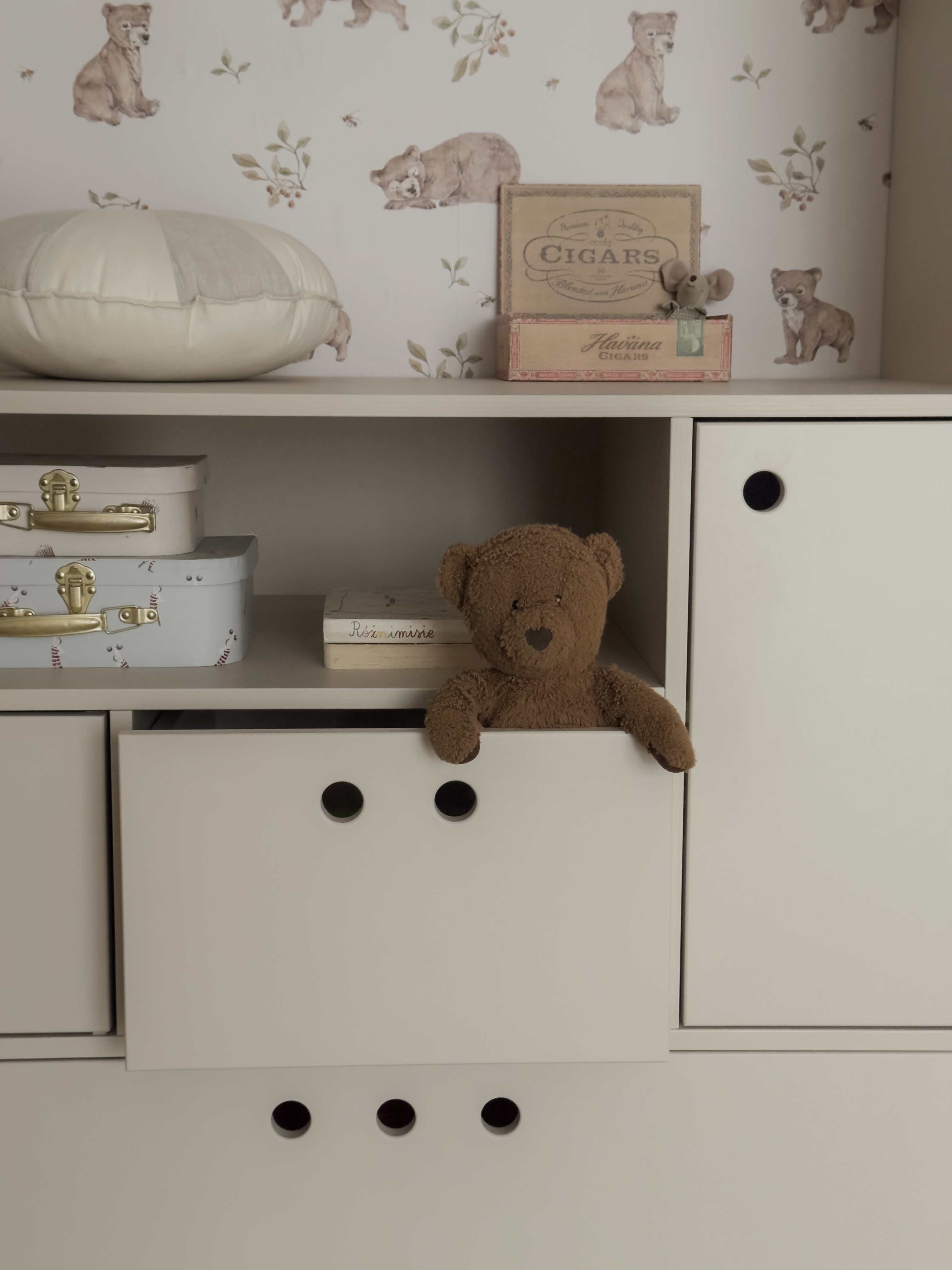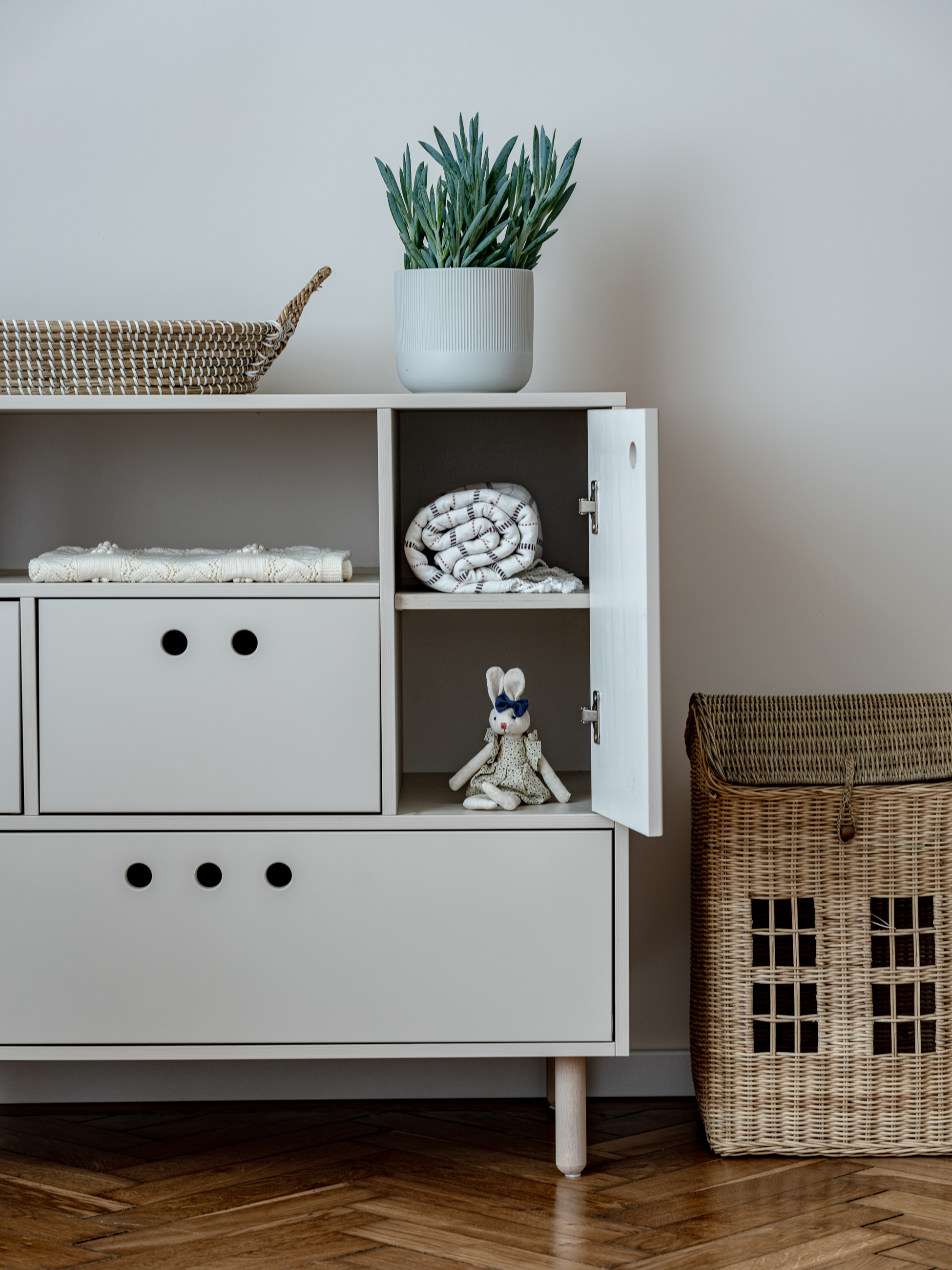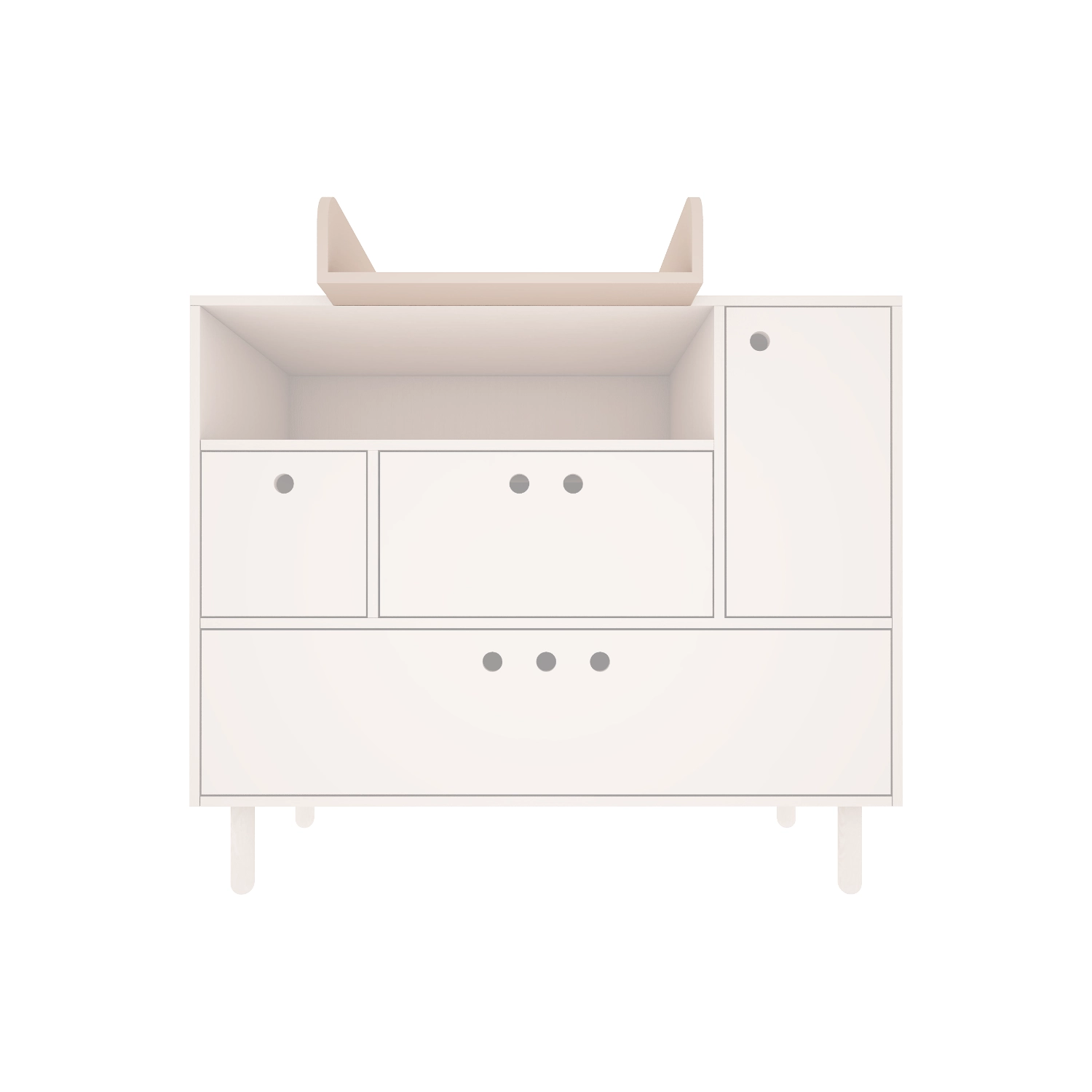 Pojemna komoda z dwiema szufladami, szafką oraz praktycznym boxem do organizacji drobiazgów. Dzięki możliwości montażu dodatkowej nakładki może pełnić funkcję przewijaka, co czyni ją idealnym meblem do pokoju niemowlaka.