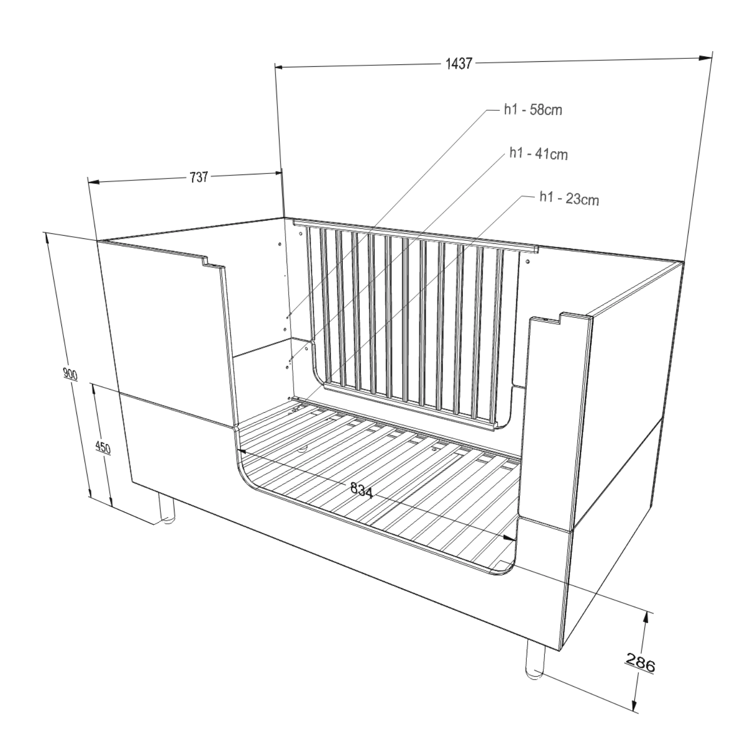 - Łóżeczko: 90 × 144 × 74 cm (powierzchnia spania 140 × 70 cm)